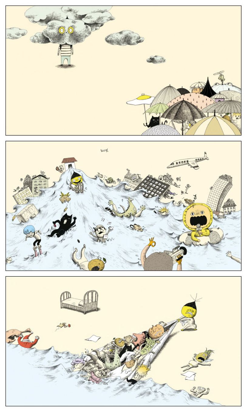 흠뻑 젖어서 집에 왔더니 공룡 두 마리가 싸우더라. 나는 방으로 들어왔어. 저녁을 남겼더니 여자 공룡이 혼냈어. 자려고 침대에 누웠는데 눈물이 나. 훌쩍거리며 울었지. 다음 날 아침 눈을 떴는데 눈물바다가 만들어진 거야. 여자 공룡과 남자 공룡뿐 아니라, 사람들이 눈물바다에 떠내려가고 있었는데……. 양장.