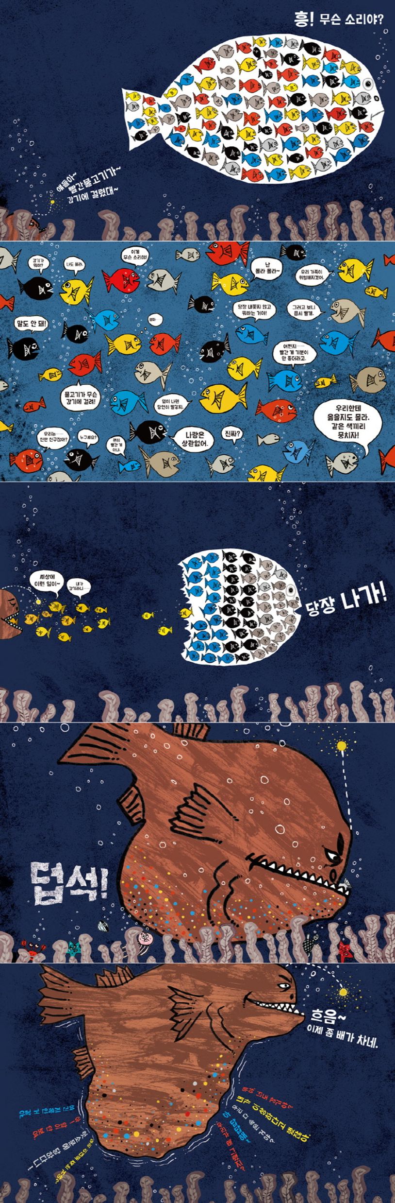 주인공은 배고픈 아귀와 알록달록한 물고기 떼입니다. 아귀는 물고기 떼를 잡아먹고 싶지만, 똘똘 뭉쳐 헤엄치는 녀석들은 쉬운 상대가 아닙니다. 어떻게 하면 물고기들을 잡아먹을 수 있을까 궁리하던 아귀는 물풀 사이에 숨어 조그만 목소리로 소문을 냅니다. “얘들아~ 빨간물고기가 감기에 걸렸대~” 소문은 조심스럽게 무리 속을 파고듭니다. 결국 “우리한테 옮기 전에 당장 내쫓자!”며 빨간 물고기를 무리에서 내보내는데….