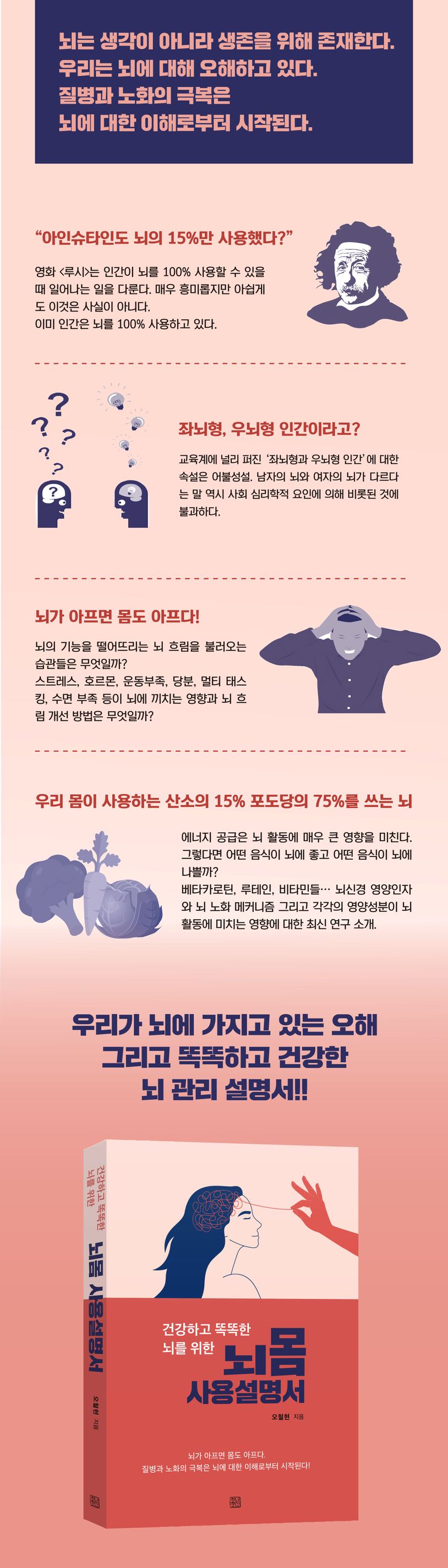 최신 뇌 과학 연구를 바탕으로 뇌에 대해 잘못 알려진 오해를 넘어 어떻게 하면 건강하고 똑똑한 뇌를 만들 수 있는지 그 비밀을 찾아가는 뇌몸 관리 핵심 키워드.