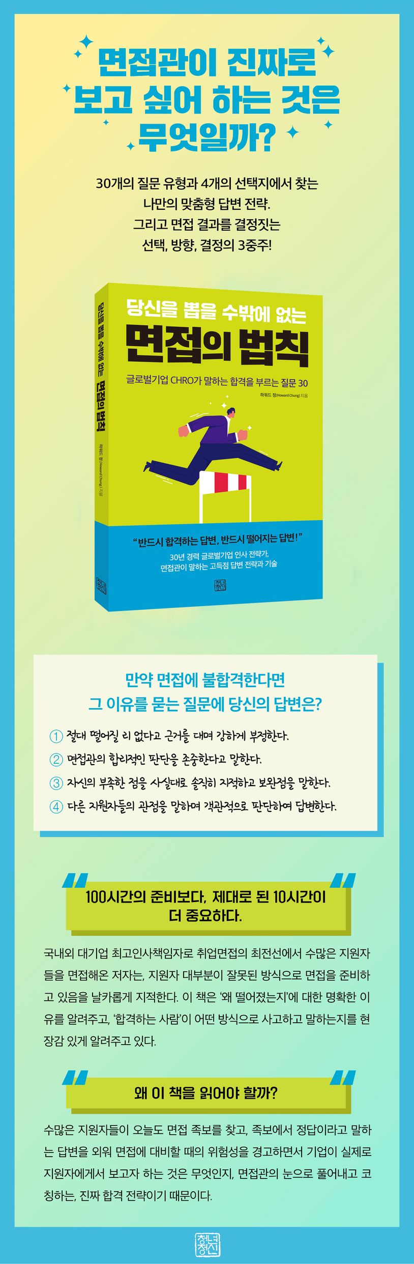이 책에서는 롯데그룹, 현대기아자동차, SC제일은행 그리고 글로벌 기업의 CHRO로서 인재 채용과 육성 전략을 담당해온 저자가, 면접에서 합격의 기쁨을 누릴 수 있는 답변 비법을 알려주고 있다. 이 책에는 단순한 면접 스킬이 아닌, 실제 현장에서 얻은 냉철한 판단과 직관을 바탕으로 구직자들이 준비해야 할 실질적인 해답을 제시하는 실전 매뉴얼이 들어 있다.