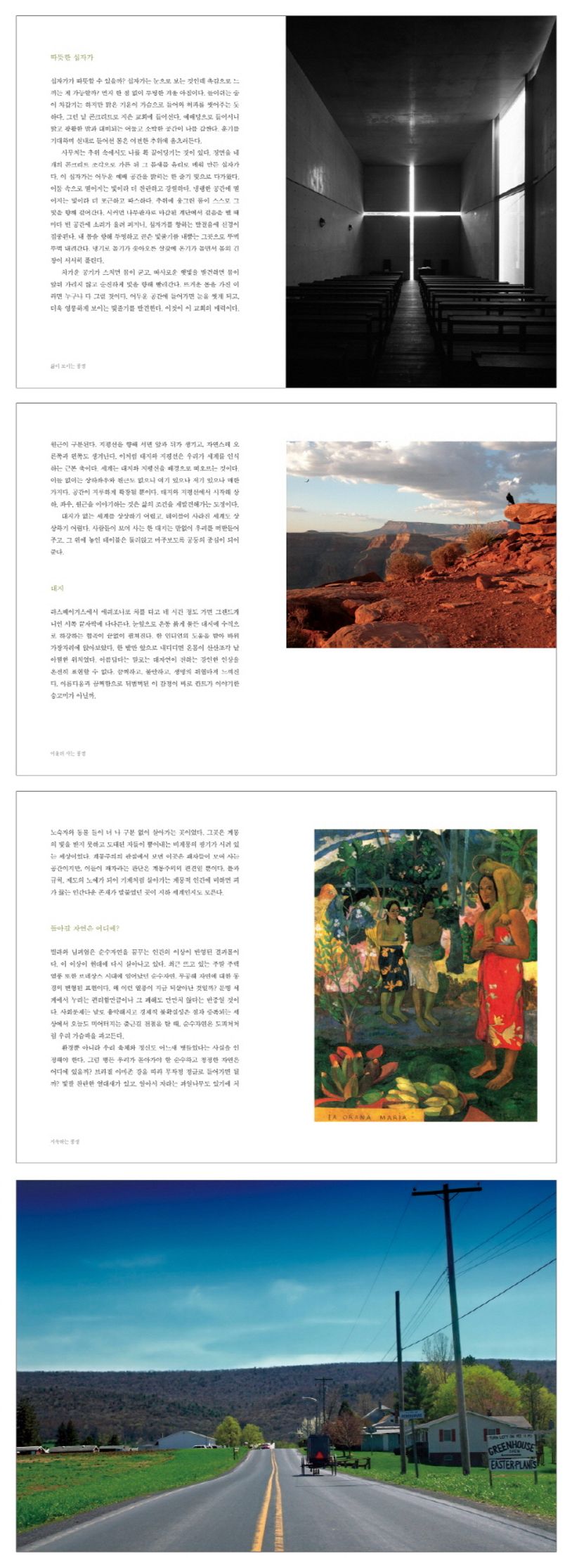 여행자라면 지나쳐버렸을 풍경의 그늘진 구석까지 놓치지 않고 찾으며 15년에 달하는 기나긴 유랑의 세월 동안 낯선 풍경과의 대화를 이어온 저자는 외부로 드러난 풍경의 차이를 해석하고, 각기 다른 풍경이 그려낸 내면의 결을 살피며 우리에게 풍경은 단순한 자연물의 집합체가 아니라 우리와 교감하는 대상임을 일깨워준다. 풍경과 풍경 사이에서 감수성의 촉수를 한껏 열어 보이며 풍경을 통해 삶과 마음을 마주하게 된다는 깨달음을 전하고 있다.