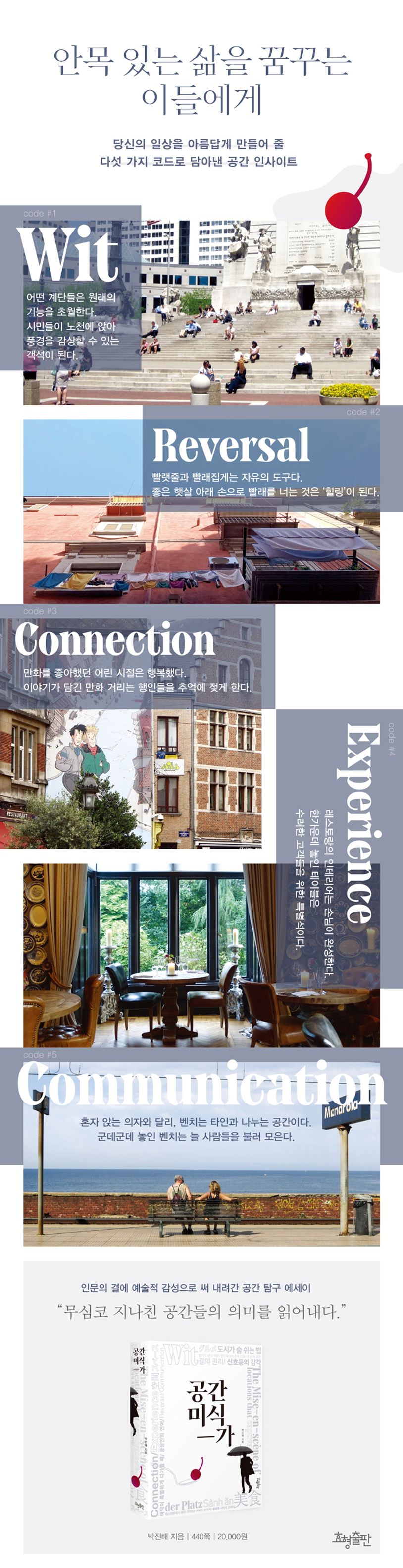 “성인은 기차를 놓치지 않는다”라는 헤밍웨이의 말처럼, 공간과 사물에 대한 감상의 본질은 안목과 축적된 연륜이 있어야만 비로소 느껴진다. 탄탄하고 깊이 있는 경험에서 우러나온 이 기록들은 공간과 사물들을 바라보는 독자들의 안목을 높여 주는 계기가 될 것이다. 그리고 Wit(재치), Reversal(반전), Connection(연결), Experience(경험), Communication(소통) 등 다섯 가지 코드로 분류한 흥미진진한 구성도 읽는 이들을 공간 미식의 세계로 인도할 것이다.