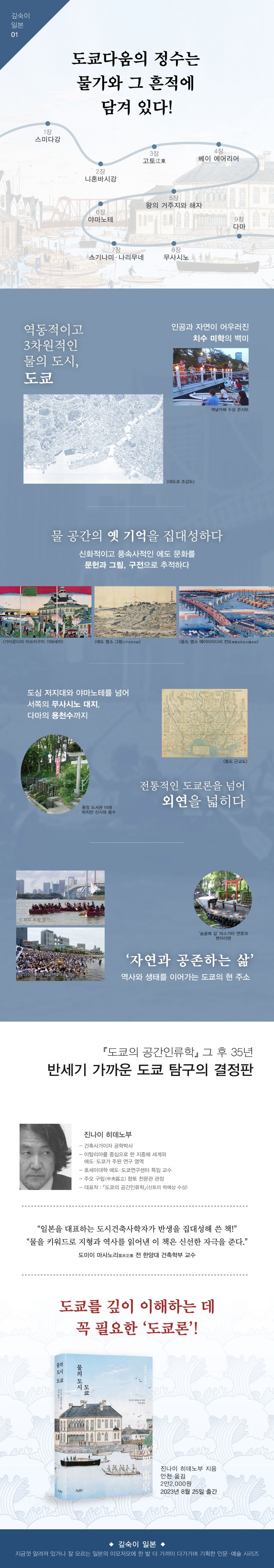 다채로운 도쿄의 물 공간은 도시의 변천과 시대에 따라 다른 양태와 문화로 다가온다. 그래서 저자는 지역별로 세분화해 톺아본다. 전반부(1~4장)에서는 ‘물의 도시론’의 주역인 스미다강, 니혼바시강, 고토(江東, 스미다강 동쪽 지역), 베이 에어리어(도쿄만 일대)를 역사의 궤적과 도시 문명 비교 차원에서 해석한다. 도쿄만이 지닌 세속적이며 때론 탐미적인 유흥 문화를 물가에 온전히 드러낸 사례도 대중문화사 차원에서 언급한다. 대표적인 물가 공간에서 대대로 요정을 운영해 온 지인과의 일화 등, 성(聖)과 속(俗)이 함께하는 공간에서 펼쳐지던 흥미로운 뒷이야기도 솔직 담백하게 들려준다. 후반부(5~9장)에서는 ‘왕의 거주지’(5장) ‘야마노테’(6장), 스기나미와 나리무네(7장), 외곽 지역인 무사시노와 다마(8, 9장)를 거닐며 저자 자신의 원풍경과 겹쳐지는 새로운 물의 도시 이미지를 제시한다.