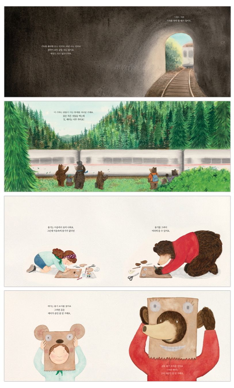 『용기 모자』는 ‘용기를 주는 모자’라는 신선한 소재를 끌어온다. 용기 모자를 쓴 메이와 곰은 각자 자신이 두려워하는 대상처럼 보이려고 노력했다. 메이는 곰처럼, 곰은 사람처럼 역할 놀이를 계속한다. 둘은 서로의 정체를 의심하지 않기 때문에 경계심 없이 즐거운 시간을 보낸다.
