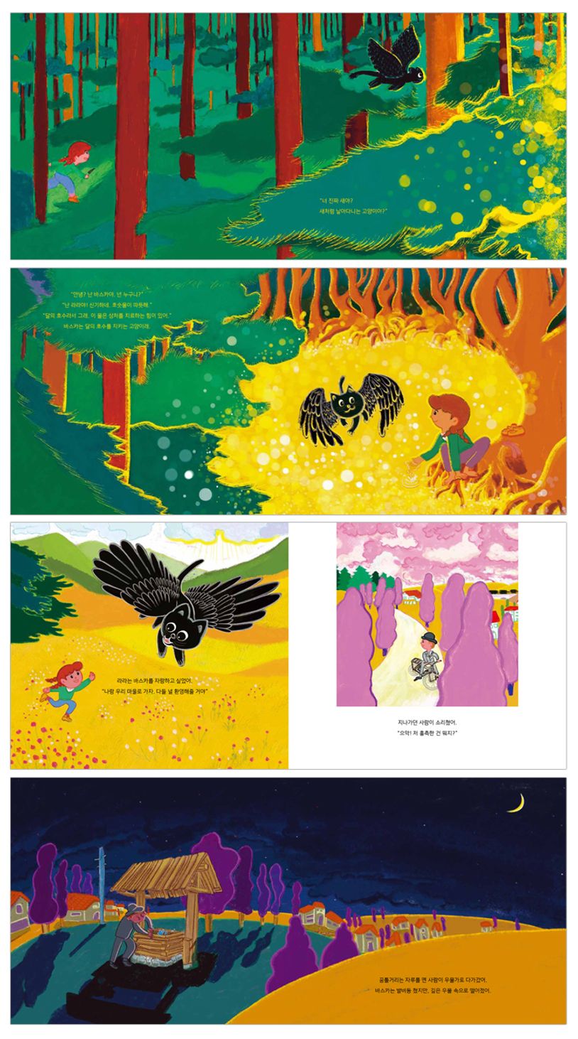 라라는 고양이를 따라갔어요. 고양이 바스카는 숲속 ‘달의 호수’를 지키는 특별한 고양이래요. 그는 달의 호수가 상처 난 동물들을 치료해주는 신비한 힘이 있다고 말했어요.