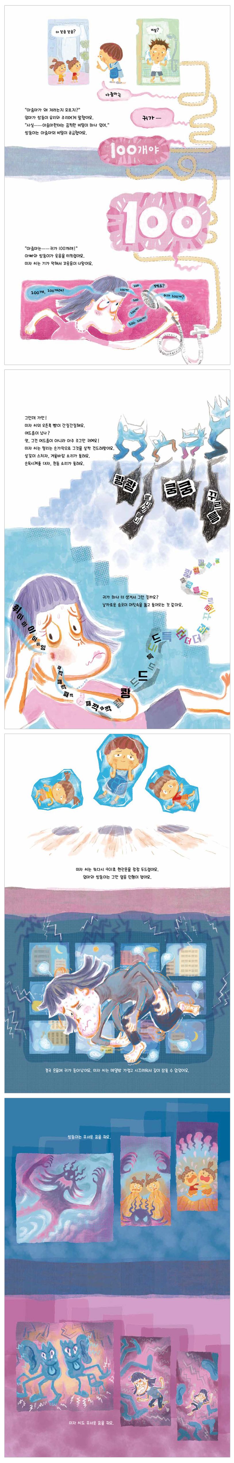 엄마가 비밀이라면서, 아래층 미자 씨는 귀가 100개나 달려 있으니까 조용히 놀아야 한다고 말했어요. 쌍둥이는 엄마가 농담하는 줄 알고 깔깔 웃었어요. 이제 와 생각하니 그게 맞는 것 같아요. 쌍둥이가 움직일 때마다 미자 씨가 뛰어 올라와 야단을 쳤거든요. 엄마는 허리를 굽히며 사과하곤 했어요. 하지만 미자 씨는 매일 점점 더 크게 소리를 지르며 화를 냈어요.