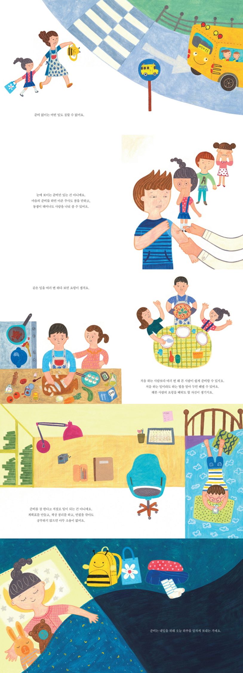 예쁜 그림과 쉽게 간략한 설명이 곁들여져 준비가 무엇인지 왜 필요한지를 쉽게 이해할 수 있게 하는 그림책이다. 한 가지 주제를 15꼭지에 걸쳐 차근차근 풀어낸 정보그림책 《미리미리 “준비”》는 입에 착착 감기고 귀에 쏙쏙 들어오는 리듬감 있는 글, 텍스트를 보완하는 역할에 머물지 않고 한눈에 내용을 알아볼 수 있는 정보가 담긴 개성 가득한 그림, 누구나 공감할 수 있는 엔딩 메시지가 돋보인다.