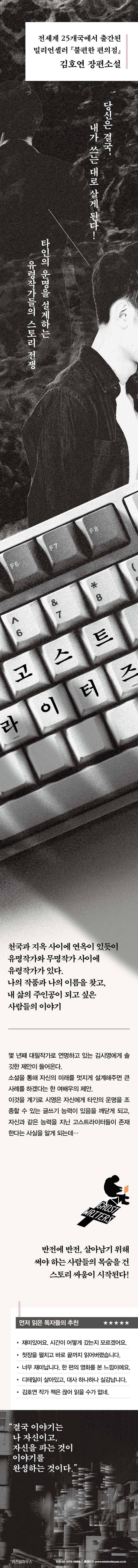 김호연 작가의 세 번째 장편소설 『고스트 라이터즈』가 새로운 옷을 입었다. 오랜 시간 축적해온 작가로서의 경험과 고민을 흥미로운 상상력으로 녹여낸 이 작품이 『불편한 편의점』으로만 김호연을 접한 독자들에게 또 다른 장르적 재미를 선사할 것이다. 평범한 소시민들의 삶을 유머러스하면서도 따뜻하게 그려낸 『불편한 편의점』,『망원동 브라더스』가 김호연의 휴머니즘 색깔을 대표한다면, 『고스트 라이터즈』, 『파우스터』는 생동감 넘치는 묘사와 구성으로 그의 영화적 판타지를 잘 보여주는 작품이라고 할 수 있다.