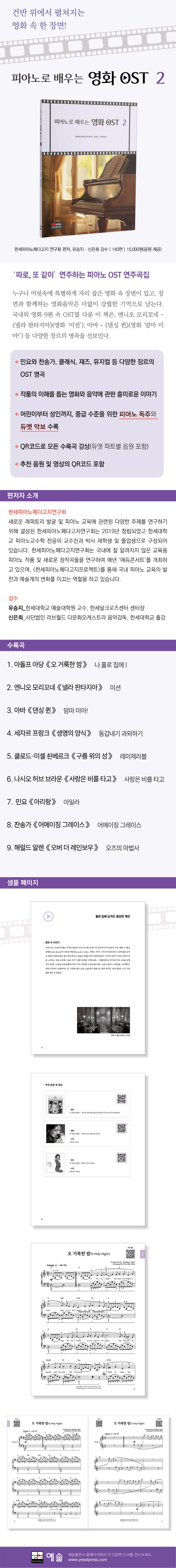 『피아노로 배우는 영화 OST』 시리즈의 2권으로, 국내외 영화 9편 속 OST의 피아노 솔로와 듀엣 악보를 실은 연주곡집이다. 1권이 클래식 명곡 OST로 음악사의 흐름을 짚었다면, 2권은 엔니오 모리꼬네 《넬라 판타지아》, 아바 《댄싱 퀸》, 찬송가 《어메이징 그레이스》와 같이 민요와 찬송가, 클래식, 재즈, 뮤지컬 등 다양한 장르의 곡들을 통해 더 폭넓은 음악 체험을 가능하게 하였다.