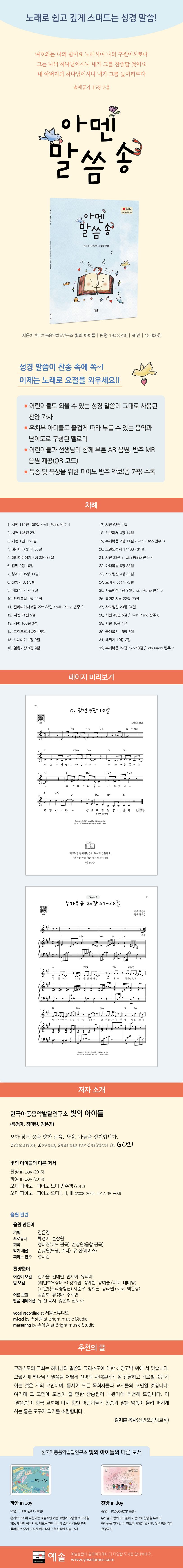수록된 모든 찬양은 성경 말씀을 오롯이 담아내고 있는 가사로 이루어져 있으므로, 어린이를 비롯하여 모든 교인들이 노래를 통해 말씀을 쉽고 즐겁게 암송할 수 있습니다. 말씀을 담는 그릇 역할을 하는 멜로디는 가사와 잘 어울리고 음악적으로 아름다우면서도 어렵지 않아서 금방 배워서 부르기 좋습니다.