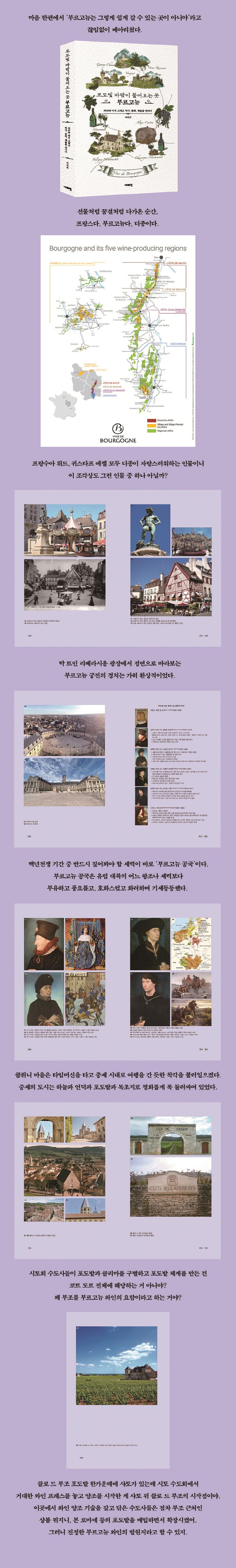포도밭에불어오는오월의봄바람과경사진언덕에비치는햇살,오감을자극하는냄새는부르고뉴를온통연둣빛으로물들인다.따사로운햇볕에열매가영글고주저리주저리포도가익어가는계절이되면이곳은단풍으로황금물결을이룬다.수확이끝난들판의포도밭은붓으로점을찍어그린도화지속모자이크처럼색색이물들어자연이그려낸작품을보는듯하다.코트도르의포도밭엔그옛날중세수도사들의땅을일군수고와연구그리고피,땀,눈물의열매가맺혀있다.