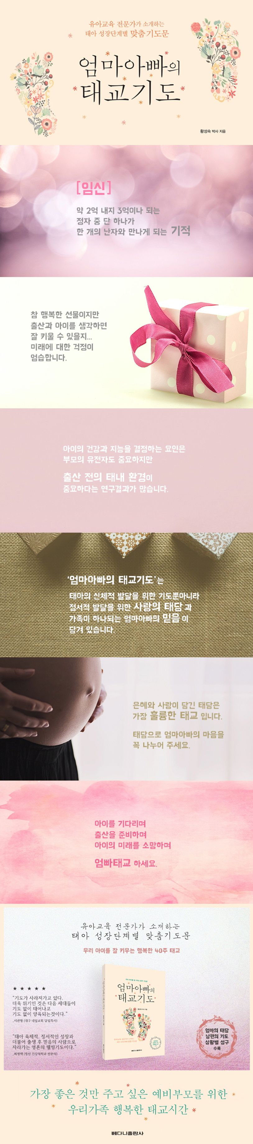 「엄마아빠의 태교기도」는 임신 준비에서부터 출산 후까지 우리아이의 주수별 성장 과정에 맞춰 건강하게 자라도록 돕는 40주 태아기도문이다. 부부가 함께 마음을 모아 태아의 40주수별 성장과정을 따라 기도할 때, 부부에게는 서로를 격려하며 하나님과 친밀한 교제의 시간이 되고, 태아에게는 엄마아빠의 사랑과 축복을 공급받는 행복한 시간이 되어 가족 모두가 사랑으로 하나 되게 한다.