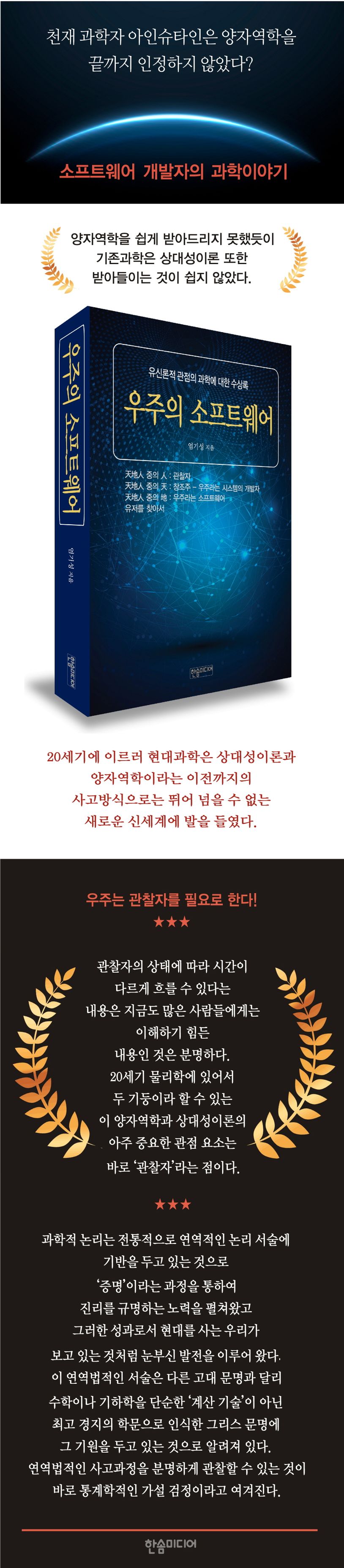 머리말/4프롤로그-1.서로를바라보는과학과성경/11 2.신앙적방법과과학적방법/18제1부天地人중의人:관찰자제1장평범한지구위의관찰자/311.코페르니쿠스의법칙/312.당사자와관찰자-인간이론/373.현대과학이발견한관찰자/434.해석과의미부여/51제2장관찰자가바라보는하나님과우주/591.천지인(天地人)-하나님과우주그리고관찰자/592.필요이상으로광대한우주/72제2부天地人중의天:창조주-우주라는시스템의개발자제3장인간과컴퓨터그리고하나님/831.시스템개발자로서의하나님/832.프로그래머로서의하나님/883.객체지향이론그리고진화론/96제4장종교와과학그리고인간/1191.유신론과무신론/1192.과학-또다른선악과일까?/1443.무신론의그늘/1494.지금도계속되는종교재판/1585.성경의무오성(無誤性)과과학/167제3부天地人중의地:우주라는소프트웨어제5장수학적인우주/1971.아름다운수학/1972.불완전한대칭/2093.양자론-구현된디지털의우주-우주의계획된헐거움/2194.플랑크시간/236제6장확률이라는안개/2401.카오스-우주라는소프트웨어에숨겨진하나님의인터페이스/2402.끈이론-NothingorEverything/2633.이신론(理神論,deism),그리고이기이원론(理氣二元論)/2854.논리적설계와물리적구현/307제4부유저를찾아서제7장우주정보시스템/3111.최적화를따라가는우주/3112.시뮬레이션우주론/3173.우주의모든개체(Object)는정보단위이다/3294.궁창/3345.하늘을펼치셨다/3416.확률의안개속에숨겨진유저인터페이스/350제8장하고싶은이야기들/3581.우연과필연/3582.경사길을내려가는우주그리고경사길을올라가야하는인간/3803.우주의최종산출물-우리들의이야기/4044.생육하고번성하라/4195.돌아온탕자/428에필로그-너는나를누구라하느냐?/448부록:개념정립-컴퓨터와소프트웨어부록A장컴퓨터라는나라/4631.컴퓨터나라의몇마디말을배워봅시다/4632.컴퓨터나라의정부기구/475부록B장소프트웨어는어떻게개발되는가?/4971.프로그래밍이란?/4972.객체지향이론(ObjectOrientedMethod)/503찾아보기(Index)/517