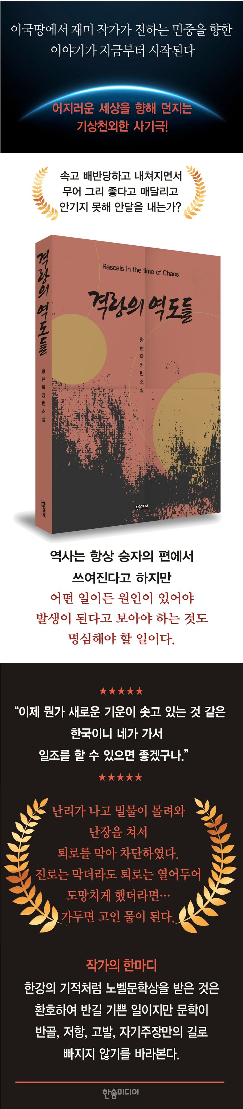 한강의 기적처럼 노벨문학상을 받은 것은 환호하여 반길 기쁜 일이지만 문학이 반골, 저항, 고발, 자기주장만의 길로 빠지지 않기를 바라본다.