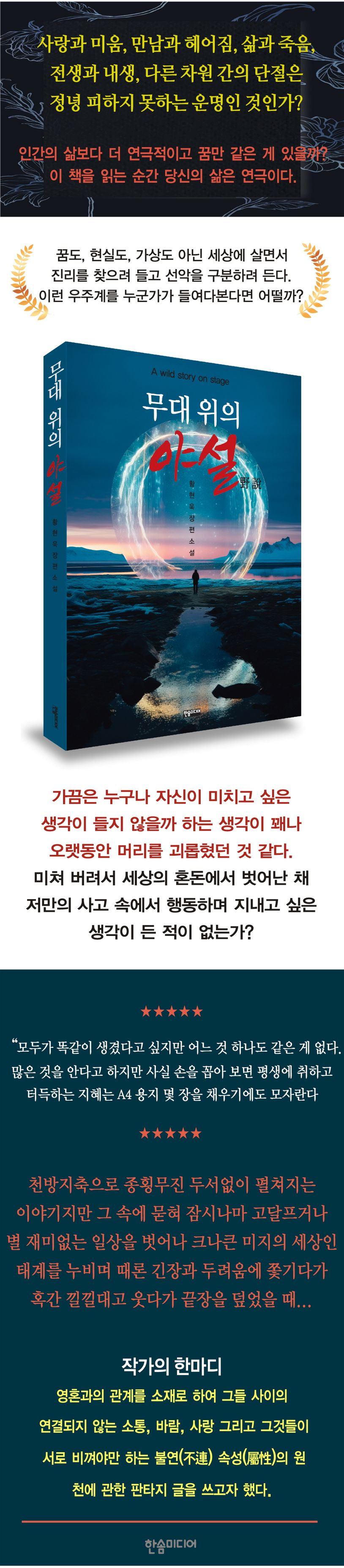 사랑과미움,만남과헤어짐,생(生)과사(死),전생과내생,다른차원간의단절은정녕피하지못하는운명인것인가?어떤이유나속성으로그리되는것일까?뚫거나헤쳐서혹은이음을만들어소통하고왕래할수는없을까?생과사,혼령과육신,마음과마음,시간과시간을막아서서공포,두려움,안타까움,어긋남등으로관계를불연(不連)케하는것은무엇일까?영혼과의관계를소재로하여그들사이의연결되지않는소통,바람,사랑그리고그것들이서로비껴야만하는불연(不連)속성(屬性)의원천에관한판타지글을쓰고자했다.그런소재는그동안알고믿어오던것들과달리생소함이있어그에따른전개또한역발상적인것이되어야하는것이라며,자칫어쭙잖은소설이될수도있을거라그만두라는권고를받았었다.실제가능한서사라고는하지만딱히그러하리라는뒷받침될근거가있는것도아니고얼핏보아흔히들들먹이는혼령을소재로한진부함이보이기도하고,판타지에서으레등장하는외계니다른생명체니하는것들이예외없이나타나보이리라는앞선걱정탓이었으리라싶다.솔직히그런만류를아랑곳하지않은채고집을꺾지않은저변에어떤특별한까닭이나이유가있었던것이아니었다.그저어눌한생각에흥미면에서는공감대를조금더얻어낼수있을것이라는알량한기대와AI의시류를타면허구적이고공상적인것이라고해서다같은부류로취급되지는않을게라는일종의반발같은나름의고집이었다.그러니까이글은처음에는소설로서의기획이아니라전설같은우화였다는것을밝힌다는것이너무장황해진것같다.가끔은누구나자신이미치고싶은생각이들지않을까하는생각이꽤나오랫동안머리를괴롭혔던것같다.미쳐버려서세상의혼돈에서벗어난채저만의사고속에서행동하며지내고싶은생각이든적이없는가?솔직히요지경삶을보여주고싶은마음이든한구석으로스스로자신의혼돈에서벗어나고자하는바람이뒤죽박죽엉켜줄거리를이어가고자급급해하는졸렬함이있었다고고백한다.걱정은순서나전개가얽혀독자들에게이글이세상을대하게되는데도움이될수있을까하는것이다.또한자칫혼돈으로빠져들게하지나않을까하는걱정도든다.하지만어떠랴!그렇게미친것같이혼돈해져보아야맑은사고의가치를헤아릴수있는계기가될수도있을것이니.또한이소설에는얼마간의종교적,정치적이야기가있는데이것역시전적으로(?)그럴수있겠구나추측하고가공한것이니혹시어떤색깔론적인의도가깔려있지나않나하는의문을가지지않길바란다.〈이하생략〉-〈책머리에〉중에서발췌