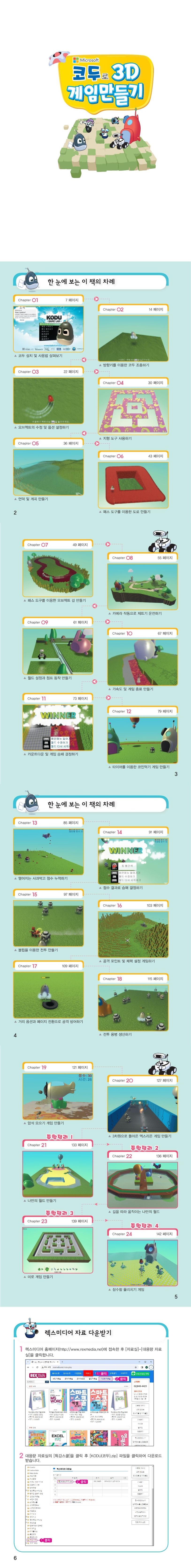 Chapter01코두설치및사용법살펴보기Chapter02방향키를이용한코두조종하기Chapter03오브젝트의수정및옵션설정하기Chapter04지형도구사용하기Chapter05언덕및계곡만들기Chapter06패스도구를이용한도로만들기Chapter07패스도구를이용한오브젝트길만들기Chapter08카메라작동으로제트기운전하기Chapter09월드설정과점프동작만들기Chapter10가속도및게임종료만들기Chapter11카운트다운및게임승패결정하기Chapter12타이머를이용한코인먹기게임만들기Chapter13떨어지는사과먹고점수누적하기Chapter14점수결과로승패결정하기Chapter15블립을이용한전투만들기Chapter16공격포인트및체력설정게임하기Chapter17거리옵션과페이지전환으로공격방어하기Chapter18전투용병생산하기Chapter19암석모으기게임만들기Chapter203차원으로돌아온엑스리온게임만들기Chapter21나만의월드만들기Chapter22길을따라움직이는나만의월드Chapter23미로게임만들기Chapter24잠수함물리치기게임