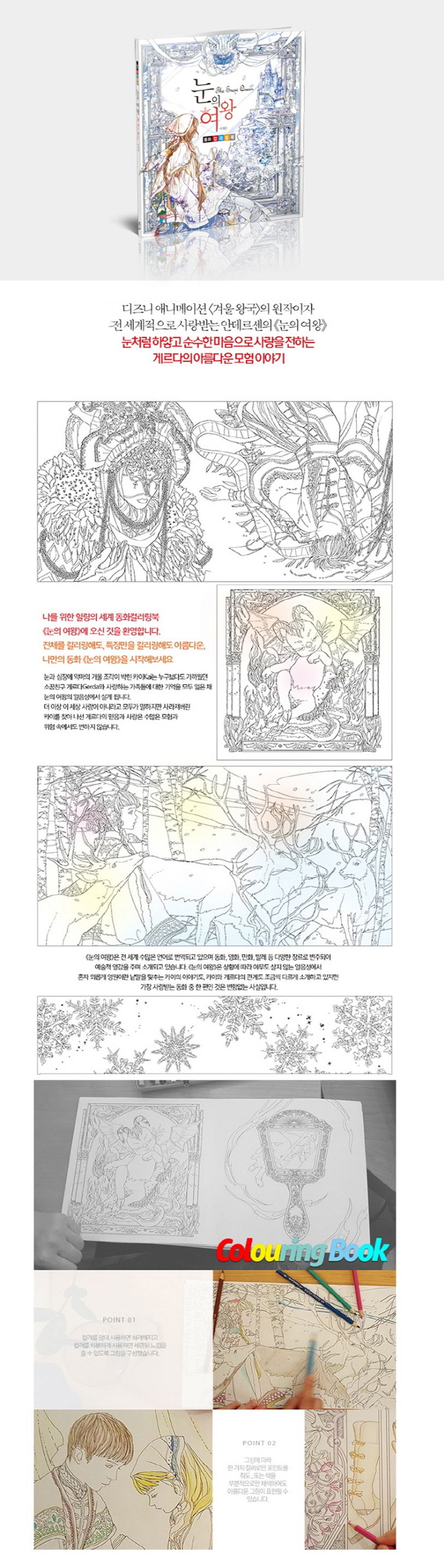 동화 컬러링북으로 재탄생한『눈의 여왕』. 차갑게 얼어붙은 카이의 마음을 녹여 내리는 게르다의 사랑과 모험 이야기를 담은 안데르센의 작품입니다. 마음에 드는 페이지를 컬러링하며 동화 속 한 장면에 빠져보세요. 천천히 음미할수록 더욱더 생생하게 내용이 눈앞에 펼쳐질 것입니다. 그림 속 겨울은 모든 것을 얼려버리는 계절이지만 모든 생명을 보듬는 아름다운 시간이기도 합니다. 신비로운 눈이 만들어내는 진풍경은 일상의 열기를 식혀줄 것입니다.