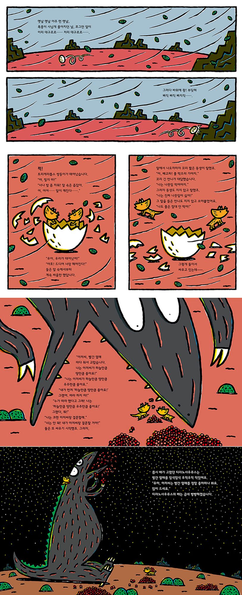 눈만 마주쳐도 싸우기 시작하는 트리케라톱스 아기들을 지켜보던 티라노사우루스는, 보다 못해 우렁우렁 꾸짖고 쌍둥이들을 돌보기 시작합니다. 그동안 외톨이로 혼자 지내던 티라노사우루스에게 드디어 가족이 생긴 것이지요. 티라노사우루스는 트리케라톱스 쌍둥이에게 빨간 열매를 따 주고, 아기 공룡들을 덮치려던 다스플레토사우루스를 쫓아내 주고, 같은 둥지에서 잠들고, 순수한 아이들의 마음에 감동을 받기도 하고, 하루 종일 쌍둥이들과 함께 지내며 진정한 행복을 깨닫게 됩니다. 하지만 어느 날 아침, 갑자기 화산이 폭발하고 용암이 셋의 보금자리를 향해 꾸르렁 꿀렁 쫓아옵니다. 용암을 피해 도망가던 셋의 눈앞에는 낭떠러지가 기다리고 있었고, 티라노사우루스는 겁에 질린 아기들을 위해 자신의 몸을 던져 다리를 만들어 쌍둥이들을 건너편으로 건너가게 합니다.