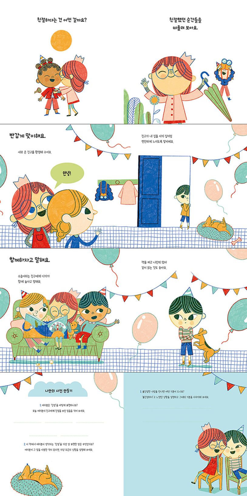 〈기분을 말해요 - 친절해요〉는 친절하다는 감정을 다양한 상황으로 보여주며 그 감정을 이해하고 제대로 표현하도록 돕는 그림책이에요. 친구에게 먼저 다가가는 것, 친구의 말에 귀를 기울이는 것, 친구의 차례를 기다려주는 것 등은 모두 스스로가 친절하다고 느낄 수 있는 기분이지요. 〈기분을 말해요 - 친절해요〉를 통해 자신은 ‘친절하다’는 기분을 어떻게 표현하는지, 반대되는 감정을 느끼는 경우는 어떤 건지 알아갈 수 있어요. 상황에 대한 반응인 자신의 감정을 올바르게 파악하는 건 자신을 이해하는 데 매우 중요해요. 또한 감정 표현은 타인과의 올바른 의사소통을 위한 첫걸음이기도 하죠. 감정을 자기 식으로 표현하고 그 의미를 되짚어보는 시간을 통해 자신을 알고 남을 이해하는 건강한 아이로 자랄 수 있을 거예요.