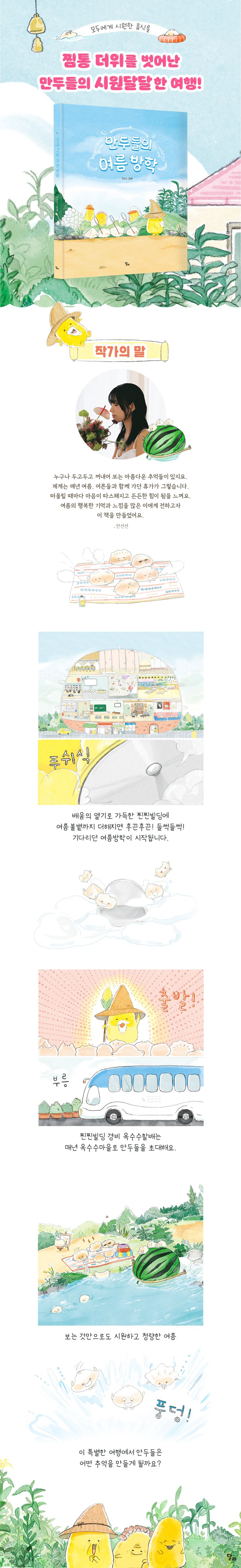 《만두들의 여름 방학》은 《다 고쳐요! 달퐁 병원》으로 따뜻한 상상력을 선보였던 안선선 작가의 신작이에요. 올망졸망 귀여운 만두들의 특별한 여름날이 사랑스럽게 펼쳐지지요. 찐찐빌딩에서 함께 배우고 경쟁하던 친구들이 모두 같이 떠나서 특별하고, 부모가 아닌 옥수수할배의 보살핌 속에서 이 신나는 시간들을 보낸다니 또 특별하죠. 장면마다 펼쳐지는 아이들의 찐웃음과 다정한 어른들의 마음을 우리도 함께 누려볼까요?