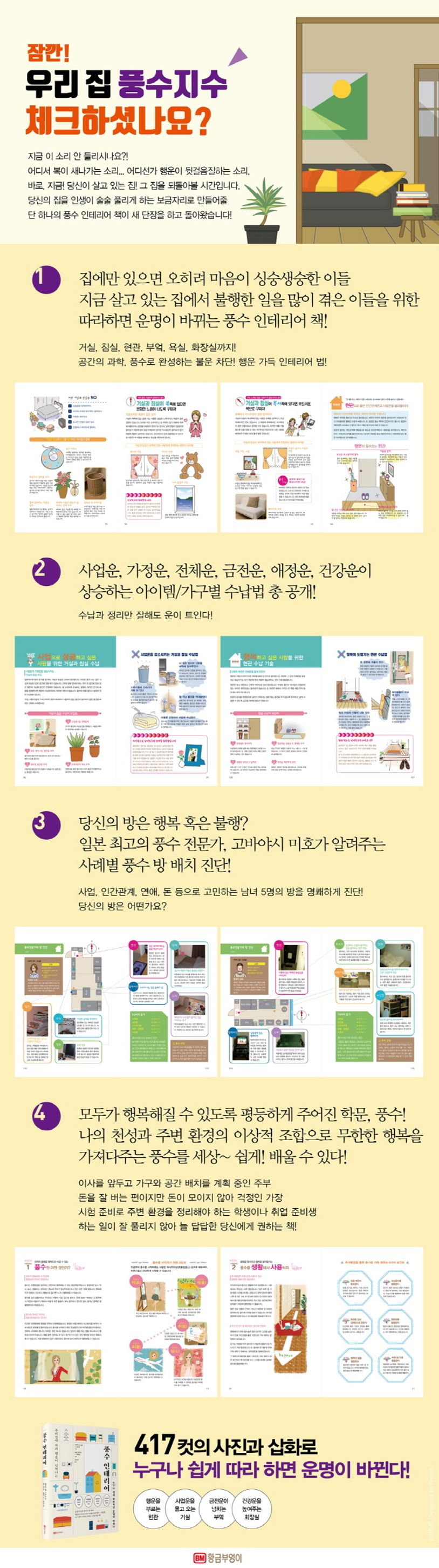 책에서 저자는 풍수가 자연에서 나오는 좋은 기를 흡수하여 사람의 운기를 높여준다고 말한다. 그 운기를 좋게 만드는 것도, 나쁘게 만드는 것도 다 자기하기 나름이라고 한다. 책을 통해 좋은 운기로 가득 찬 집을 만들어 보자.