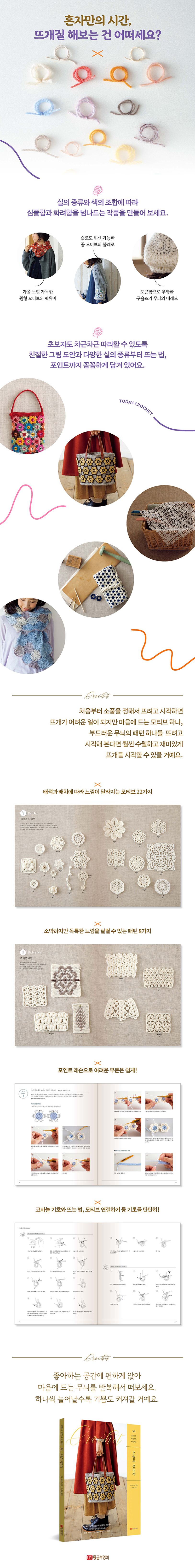 혼자만의 취미로 뜨개질을 시작하고 싶지만 어디서부터 시작해야 할지 막막한 뜨개 입문자를 위한 책입니다. 처음부터 큰 소품을 뜨려고 시작하면 뜨개가 어려운 일이 되지만 마음에 드는 모티브 하나, 사랑스런 패턴 하나를 뜨려고 시작해 본다면 훨씬 수월하고 재미있게 뜨개를 시작할 수 있습니다. 책에는 모티브와 패턴을 연결하여 만들 수 있는 손뜨개 소품 32가지가 소개되어 있습니다. 볼레로, 숄, 머플러, 가방, 모자, 무릎담요, 풀오버 외에도 목걸이, 헤어핀 같은 액세서리와 도일리, 핀쿠션, 티포트 커버 등의 코바늘 소품이 그것입니다. 초보자가 뜨기에 조금 어렵다 싶은 소품은 따라하기 과정이 컬러 사진으로 설명되어 있습니다. 코바늘뜨기의 기호와 뜨는 법, 모티브 연결법 또한 세세하게 정리되어 있어서 어렵지 않게 손뜨개에 입문할 수 있게 도와줍니다.