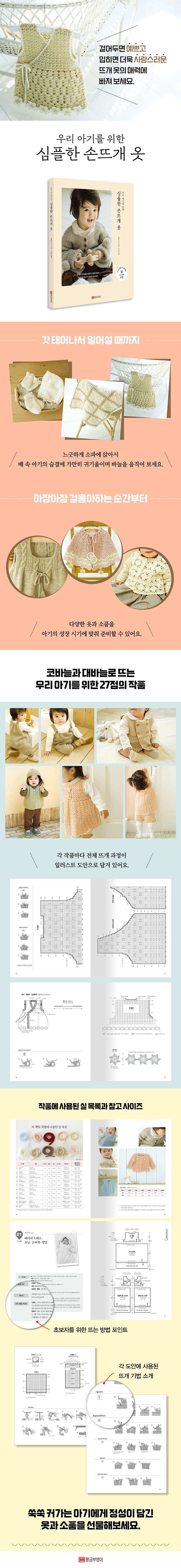 아기가 태어나길 기다리는 동안 혹은 아기가 자는 고요한 시간에 선물을 준비해보는 건 어떨까요? 갓 태어나서 일어설 때까지의 아기를 위한 속싸개, 양말, 방한용 속옷부터 아장아장 걷기 시작한 아기에게 입힐 판초, 원피스, 카디건, 모자 등 총 27점의 작품을 만나보세요. 다양한 옷과 소품을 아기의 성장 시기에 맞춰 준비할 수 있습니다. 모든 작품에 일러스트 도안과 상세한 설명이 있어 대바늘과 코바늘을 이용하여 어렵지 않게 만들 수 있어요. 하나뿐인 심플하면서도 귀여운 아기 옷을 만들어 보세요.