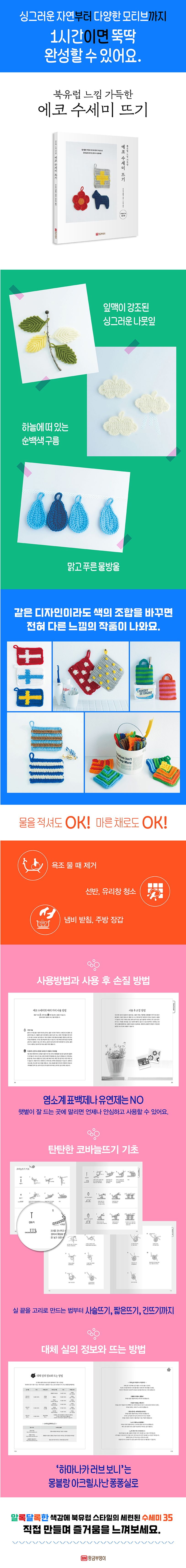 직장에서 퇴근 후 혹은 여유로운 주말도 너무 피곤해서 늘어지다 보면 집청소에 소홀해지기도 하는데요. 이럴 때 상큼하게 기분전환 겸 수세미를 직접 만들어 사용해보는 건 어떨까요? 빨강, 노랑, 파랑의 알록달록한 색감에 북유럽 스타일로 세련된 수세미를 코바늘로 떠 보아요. 코바늘뜨기의 기초도 상세히 나와 있어 초보자도 도안을 보고 쉽게 뜰 수 있어요. 청소용으로도 인테리어 소품으로도 가벼운 선물로도 좋은 수세미. 1시간이면 뚝딱 완성할 수 있는 아기자기한 에코 수세미로 성취감과 즐거움을 느껴보세요.
