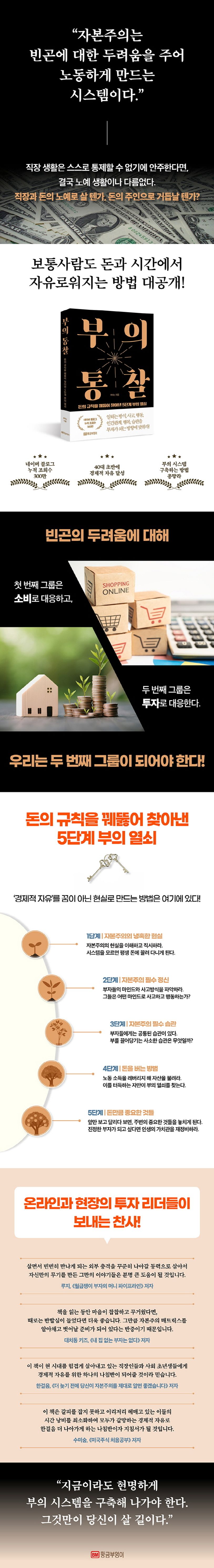 대한민국의 평범한 직장인인 저자는 직장을 다니면서 40대 초반의 나이에 경제적 자유를 달성했다. 어떻게 가능했을까? 이 책은 10명이 도전하면 한두 명만 성공하는 방법이 아닌, 보통사람도 돈과 시간으로부터 자유로워지는 방법을 이야기 하고 있다. 우리가 살고 있는 자본주의를 제대로 이해하고 활용한다면, 누구든 회사에 의존하지 않고도 경제적 자유를 이룰 수 있다. 자본주의는 빈곤에 대한 두려움을 느끼게 해서 노동하게 만드는 시스템이다. 빈곤에서 벗어나지 못한다면 평생 일을 해야만 한다. 하지만 두려워하지 말자. 《부의 통찰》은 5단계에 걸쳐 자본주의 시스템을 이해하고, 자본주의를 부자가 되는 도구로 활용하는 방법을 공개한다. 자본주의에 끌려가지 않고, 제대로 활용한다면 자본주의는 결국 나를 위해 작동할 것이다.