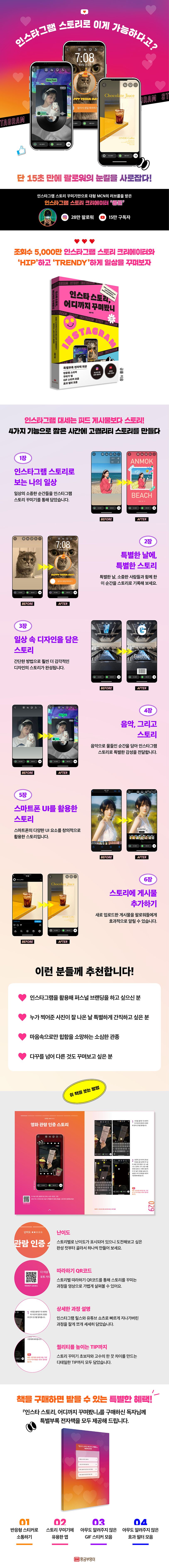 이제는 대세가 되어버린 인스타그램 스토리를 남들보다 더 예쁘고 감각적으로 꾸미고 싶은 사람들을 위해 공률의 센스 있는 노하우를 책에 모두 담았다. 인스타그램 스토리는 포토샵 같은 전문적인 편집 프로그램이 아니니 폰 하나로 부담 없이 즐겨보자. 스토리만으로도 단 시간에 퀄리티 있는 결과물을 만들 수 있다는 게 큰 장점이다. 인스타그램 릴스와 유튜브 쇼츠에서 굉장히 빠르게 지나가버린 과정을 잘게 쪼개어 꼼꼼히 수록했으니, 핸드폰을 들고 따라 하기만 하면 내 스토리 속 일상도 훨씬 감각적이고 힙해질 것이다.