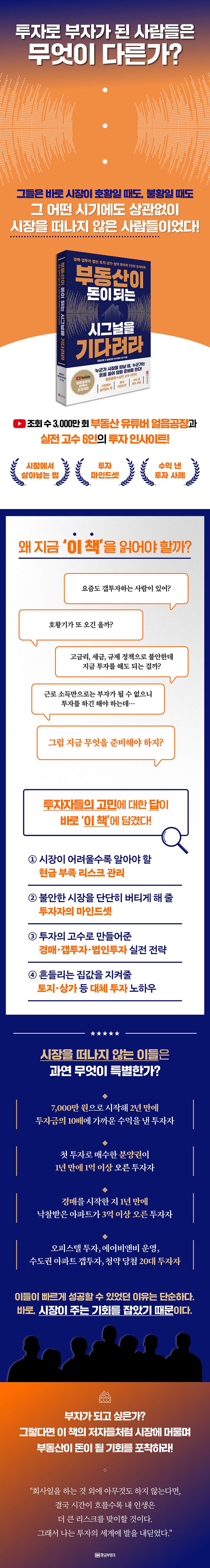 금리 인상, 세금, 정책 등 다양한 변수로 인해 흔들리는 부동산 시장이지만, 아무것도 하지 않고 근로 소득에만 의지한다면 결국 인생에 더 큰 리스크를 맞이하게 될 것이다. 아직 기회는 남아있다. 투자를 망설이고 있다면, 이 책에 담긴 투자자들의 이야기를 통해 부를 선점할 수 있는 기회를 잡길 바란다.