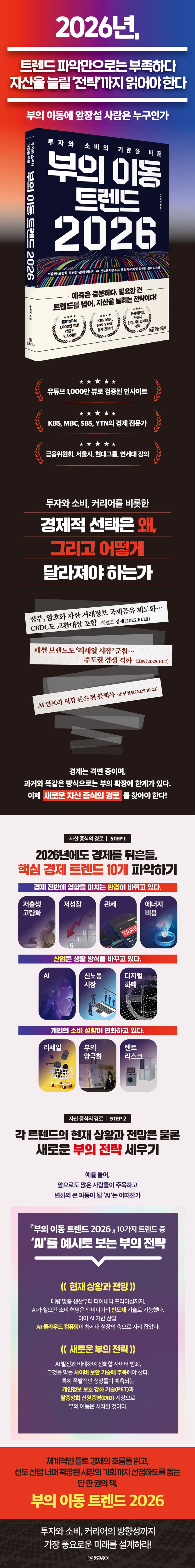 『부의 이동 트렌드 2026』은 긱워커·디지털 화폐·리세일·부의 양극화·렌트 리스크·AI·에너지 비용·관세·저성장·저출생 고령화까지 새로운 경제 질서가 될 10가지 키워드를 통해, 선점 가능한 부의 기회를 제시한다. 현재의 경제 상황을 기반으로 미래를 예측할 뿐만 아니라 폭발적인 성장세를 가진 산업을 짚어주며 투자와 소비, 그리고 커리어 전반에 걸쳐 현명한 선택을 할 수 있도록 돕는다. 이 책은 2026년 경제적 불확실성을 돌파하게 해주는 전략서가 될 것이다.