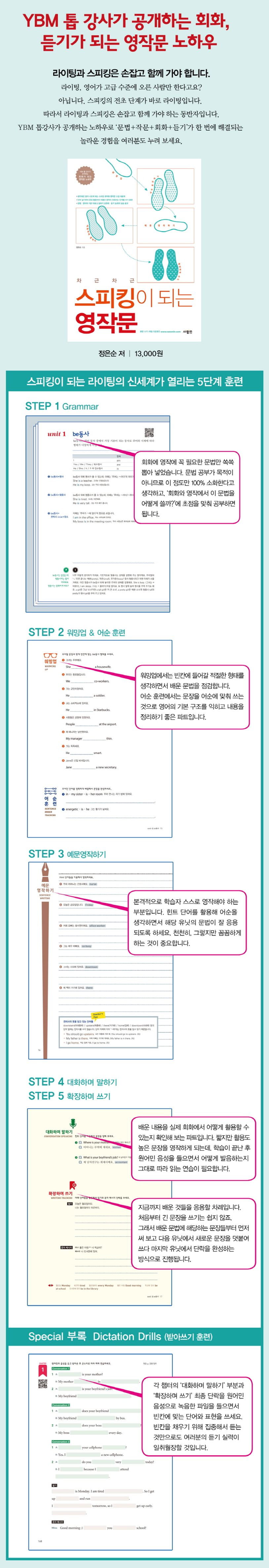 [차근차근 스피킹이 되는 영작문]은 문장이 만들어지는 기본 구조를 정확하게 이해할 수 있도록 영작의 기초가 되는 문법을 이해하기 쉽게 알려주는 교재이다. 현장에서 얻어낸 예문들을 통해 이메일, 일기, 문자 보내기 등을 다양하게 응용해 볼 수 있도록 했다. 책에서는 단어 넣기 → 어순 배열 훈련 → 주어진 힌트로 예문 영작하기 → 실제 대화문 만들기 → 실생활에 필요한 단락 쓰기로 점진적으로 어려워지는 훈련 방식을 취했다. 한 단계씩 혼자서 해낼 때마다 성취감이 늘어가면서 긴 문장도 문제없이 만들어 낼 수 있을 거시다.