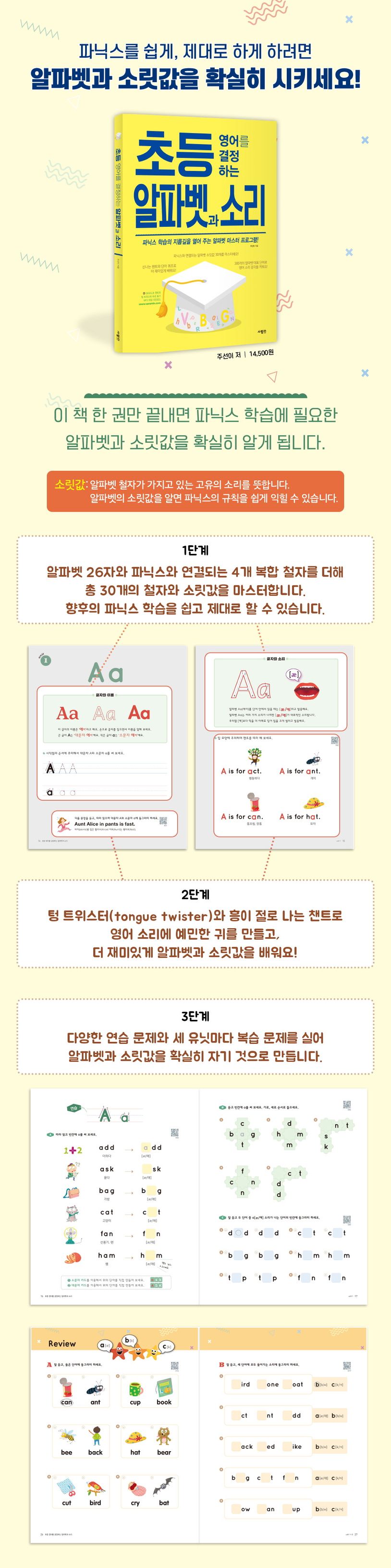 영어의 첫 시작, 알파벳! 제대로 된 알파벳 학습은 대소문자를 바르게 쓰고, 해당 알파벳의 소릿값을 정확히 아는 것입니다. 해당 알파벳의 소릿값을 정확히 알아야 하는 건 이것이 영어 글자의 소리 규칙인 파닉스로 연결되기 때문입니다. 소릿값을 모르는 상태에서 파닉스를 시작하면 아이들이 힘들어합니다. 그래서 알파벳 단계에서 철자와 소릿값을 연결하여 같이 해야 합니다. 〈초등 영어를 결정하는 알파벳과 소리〉에서는 알파벳 26자 외에 파닉스와 연결되는 4개 복합 철자를 더해 총 30개의 철자와 소릿값을 마스터해서 파닉스를 쉽고 제대로 할 수 있게 합니다!