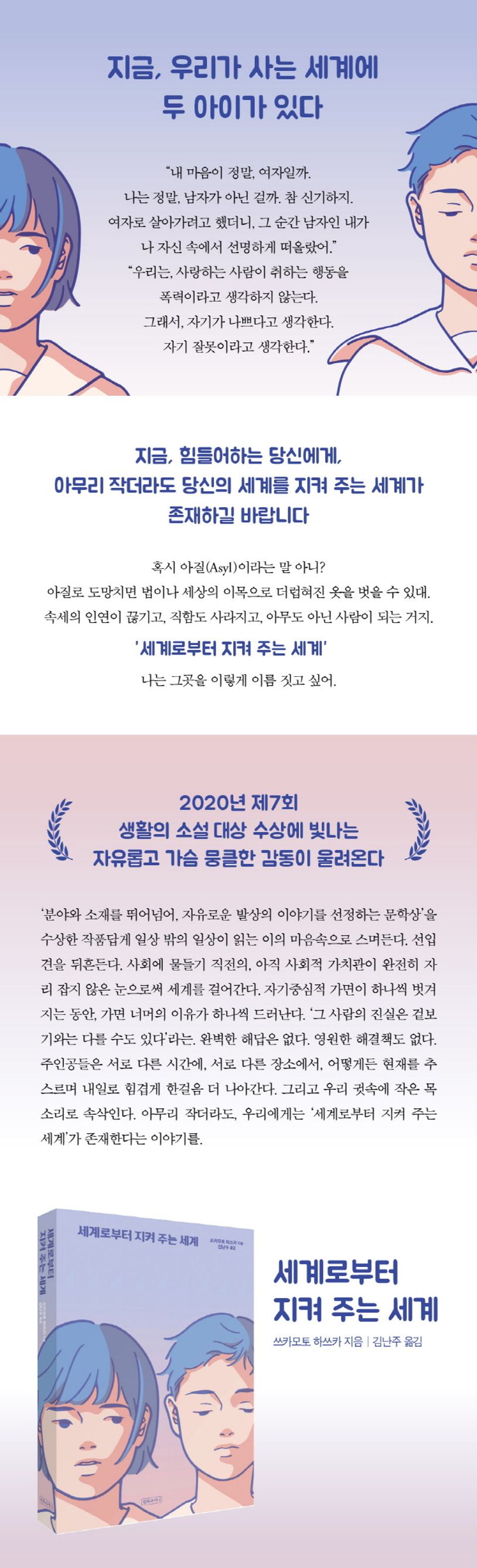《세계로부터 지켜 주는 세계》는 2020년 제7회 ‘생활의 소설’ 대상을 수상한 작품이다. ‘분야와 소재를 뛰어넘어, 자유로운 발상의 이야기를 선정하는 문학상’답게 일상 밖의 일상이 내 안으로 다가온다. 선입견을 뒤집는다. 아직 어리기에 세상을 바꿀 힘은 없다. 그러나 어리다고 해서 무력한 것만은 아니다. 오히려 그렇기에 정면으로 바라볼 수 있고, 정면으로 부딪칠 수 있다. 그래서, 결국은, ‘나는 무엇인가’ 그리고 ‘어떻게 살아 나갈 것인가’ 하는 울림을 전한다. “지금, 사라지고 싶다고 생각하거나, 죽고 싶다고 생각할 만큼 힘들어하는 사람들에게, 아무리 작더라도 당신의 세계를 지켜 주는 세계가 존재하길 바랍니다”라고.