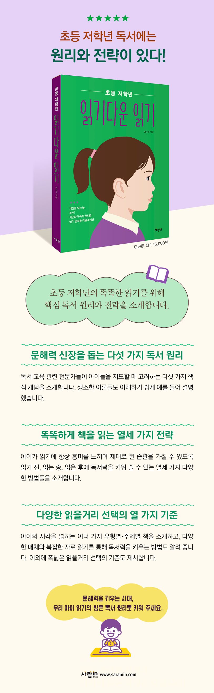 저자는 아이의 독서를 지도하기 전에 학부모가 기본적으로 알고 있어야 하는 다섯 가지 원리와 어떤 방법으로 무엇을 읽히는 것이 올바른 독서 교육의 방향이 되는지 알려 줍니다. 또, 아이와 소통을 통해 직접적으로 읽기 습관을 도울 다양한 방법도 소개합니다.