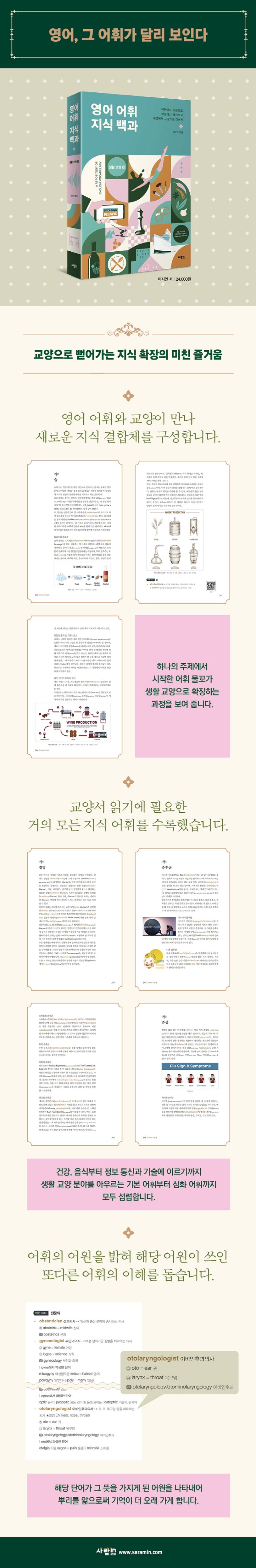 교양 관련 원서와 자료 읽기에 필요한 지식 어휘를 어원을 씨줄로, 단어 뒤에 놓인 배경지식을 날줄로 엮어 담았다. 교양서라 불리는 책에서 다루는 거의 모든 단어를 수록하여 어휘 수에서 타 어휘책을 압도한다. 어휘책 하면 떠오르는 영어-한국어 뜻의 1대1 대응 구조를 벗어나 어휘에서 어원으로, 어원에서 배경으로, 배경에서 교양으로 뫼비우스의 띠처럼 이어진다. 한 주제의 어휘에서 시작한 물꼬가 교양 지식의 어디까지 확장될 수 있는지 보여 주면서, 어휘는 포괄적 지식체의 결합이라는 어휘 학습의 새로운 틀을 제공한다.