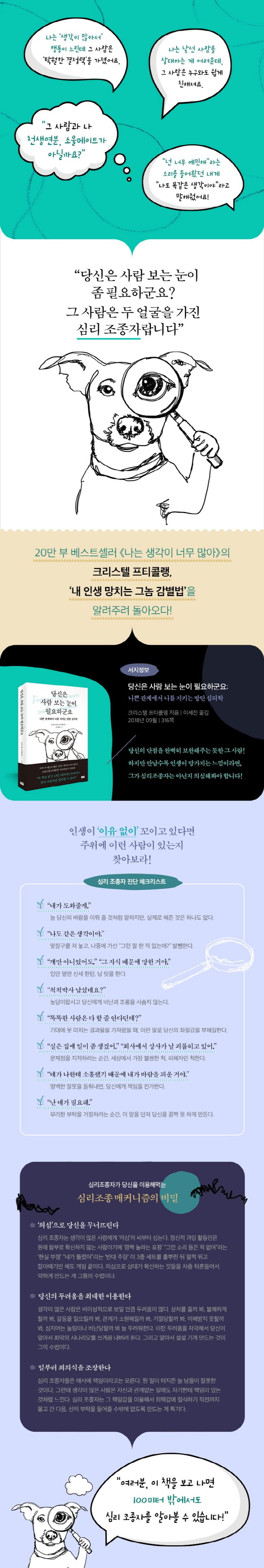 '생각이많은사람'을새롭게조명해국내20만독자에게커다란공감을얻었던《나는생각이너무많아》의저자크리스텔프티콜랭이이번에는생각이많은사람이심리조종자에게‘자꾸만’걸려드는심리메커니즘을밝히러돌아왔다.놀랍게도머리가빨리돌아가는영리한사람일수록심리조종에빠지기쉽다.역설적이지만생각이많고,똑똑한사람은상대의관점을헤아리는‘역지사지’에능하기때문이다.이들은다른사람의고약한언행과발뺌,터무니없는고집과같은난관에직면하면오히려도전욕구를불태운다.“알고보면그사람도안됐어!”혹은“나는그를변화시킬수있어!”라며굴하지않고이해의여지를찾는다.그러나심리조종자는자신의우선권을확보하기위해남을희생시키고,거짓말하고,현실을부인하고,일부러갈등을조장하는사람이다.생각이많은사람의측은지심을‘악용’하여자기잇속을챙기는데능하다.