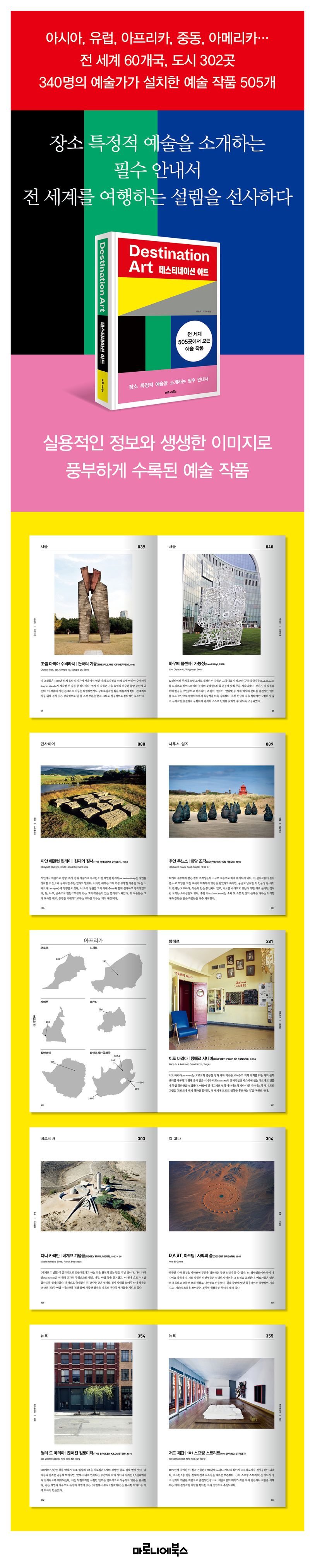 『데스티네이션 아트』는 ‘장소 특정적 예술(site-specific art)’, 즉 작품의 구성요소가 배경으로서 자연을 보충하거나 특정 장소와 조화를 이루기 위해 계획되고 배치된 미술 작품을 소개하는 안내서이다. 오스트랄라시아, 아시아, 유럽, 아프리카, 중동, 북아메리카, 남아메리카 대륙별 분류 아래 약 60개 국가와 300개 도시에 있는 작품 505점이 소개되어 있다. 번화한 대도시, 광활한 사막, 조용한 기념관, 평범한 놀이터 등 다채로운 장소에 있는 작품을 생생한 도판과 흥미로운 설명으로 만나며 전 세계를 여행하는 설렘을 느껴보자.