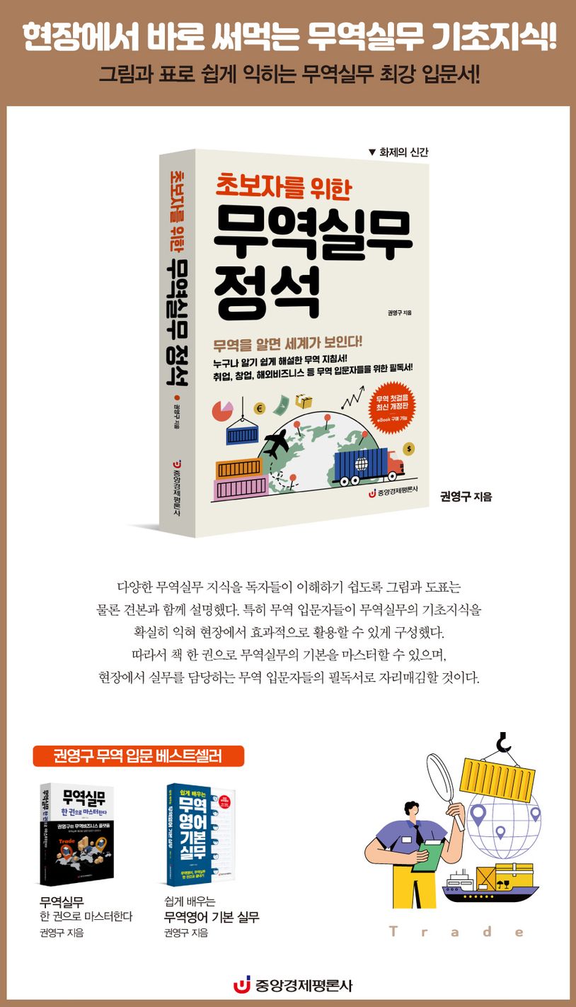 이 책은 다양한 무역실무 지식을 독자들이 이해하기 쉽도록 그림과 도표는 물론 견본과 함께 설명했다. 특히 무역 입문자들이 무역실무의 기초지식을 확실히 익혀 현장에서 효과적으로 활용할 수 있게 구성했다. 따라서 책 한 권으로 무역실무의 기본을 마스터할 수 있으며, 현장에서 실무를 담당하는 무역 입문자들의 필독서로 자리매김할 것이다.
