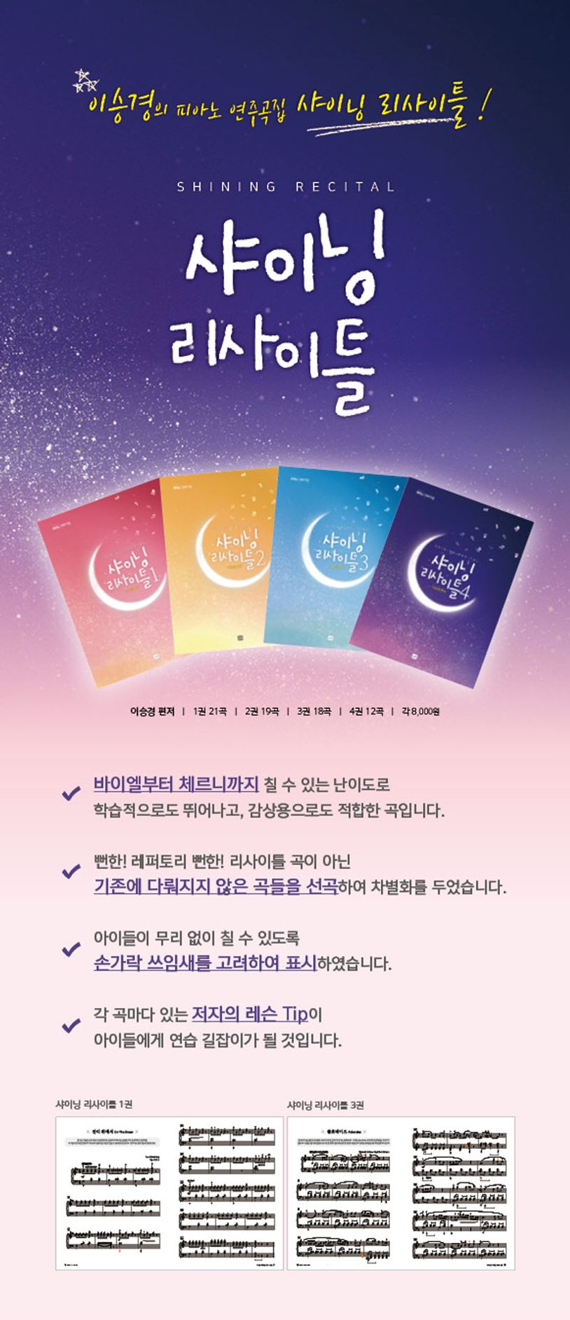바이엘을 치는 초급 레벨에서도 흥겹고 동기유발이 되며, 학습적으로도 뛰어나고, 감상용으로도 적합한 곡들로 구성한 피아노 교재. 학원에서 연주회를 할 때마다 곡 선정으로 고민하는 어려움도 덜어주려 가능한 다양한 장르를 포함하였다. 이 교재는 진도 순서로 되어있지만, 모든 곡을 학습해야하만 다음 교재로 진행하는 것은 아니고 학생이 원하는 곡을 자유롭게 선택해서 연주할 수 있다.