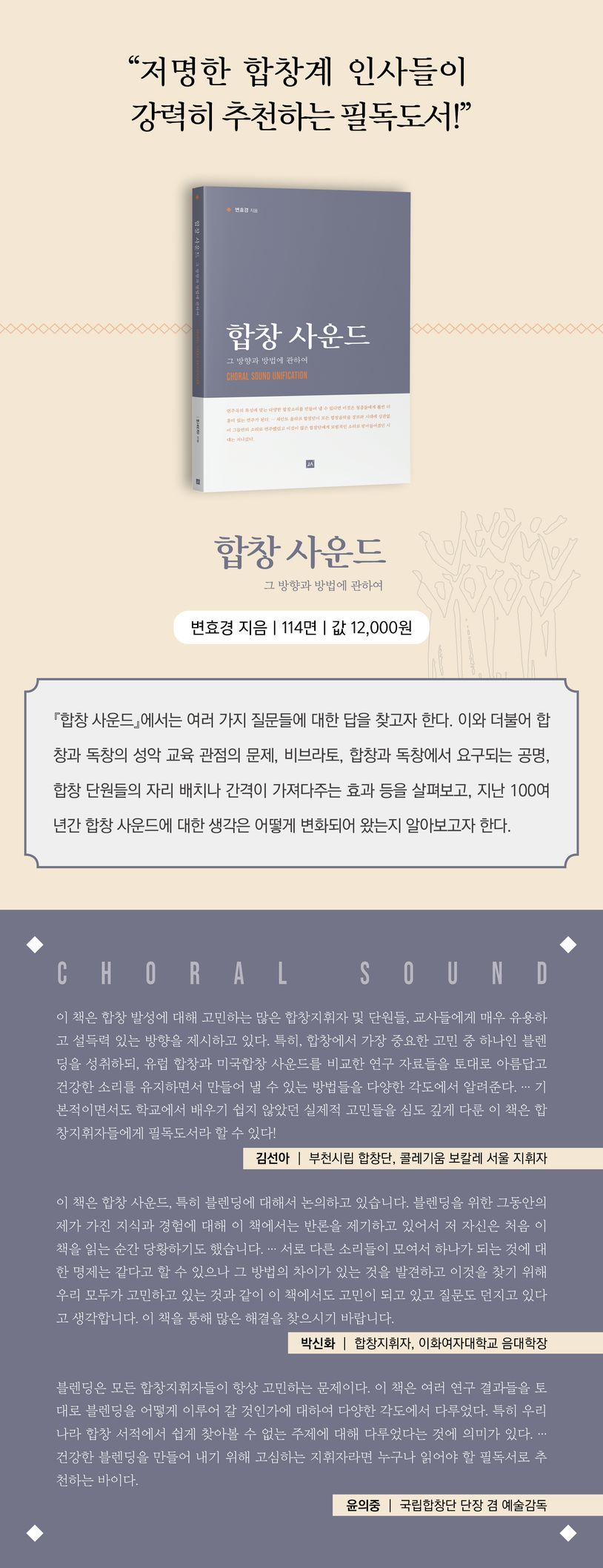 이 책에서는 이런 여러 가지 질문들에 대한 답을 찾고자 한다. 이와 더불어 합창과 독창의 성악 교육 관점의 문제, 비브라토, 합창과 독창에서 요구되는 공명, 합창 단원들의 자리 배치나 간격이 가져다주는 효과 등을 살펴보고, 지난 100여 년간 합창 사운드에 대한 생각은 어떻게 변화되어 왔는지 알아보고자 한다.