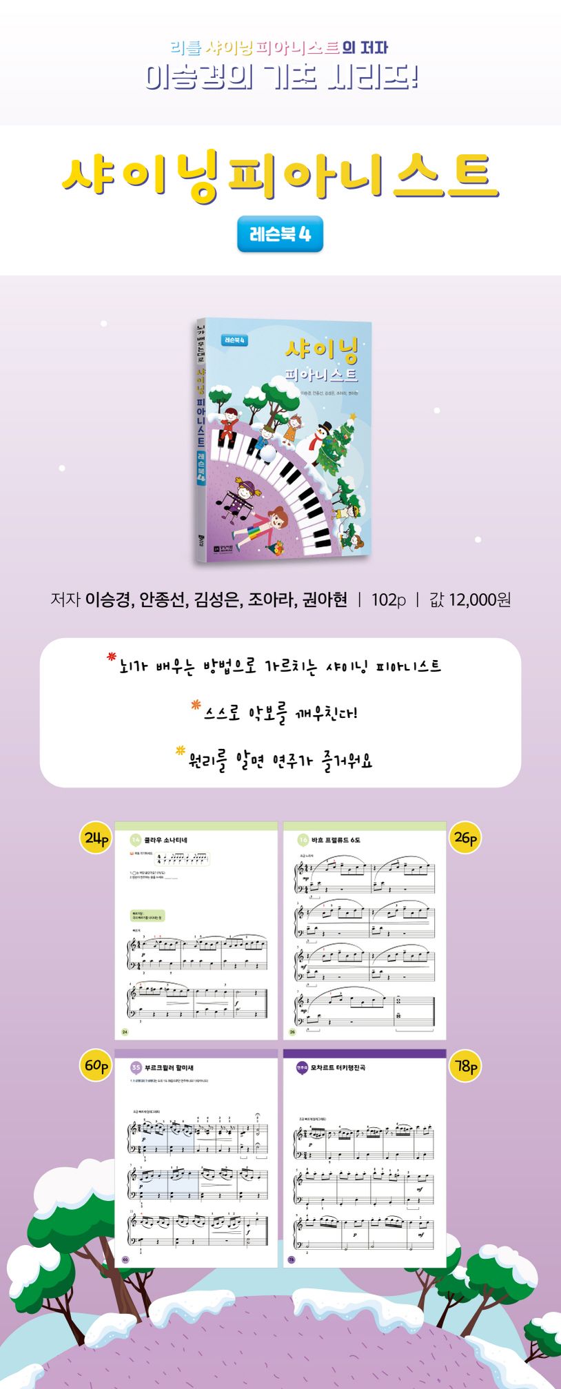 1단원:도의자리장조음계1.별똥별 022.도의자리장조음계(스케일) 043.캉캉스케일 064.클레멘티소나티네 085.노엘 096.산을넘어간곰 107.로렐라이 112단원:솔의자리장조음계8.솔의자리장조음계(스케일) 129.모차르트피아노소품 143단원:라의자리단조음계10.라의자리단조음계(스케일) 1611.빙빙돌아라 184단원:도의자리장조음계강화12.부엉이가우는밤 2013.기쁘다구주오셨네 2214.쿨라우소나티네 2415.미도솔솔미도솔솔 2516.바흐프렐류드6도 265단원:술의자리장조음계강화17.커다란꿀밤나무밑에서 2718.베토벤로망스 2819.잃어버린강아지 306단원:라의자리단조음계강화20.도나우강 3021.바이엘에튀드 3422.베토벤비창소나타 3623.체체쿨레-가나민요- 3824-1.라의자리단조바르톡연주곡 4024-2.레의자리단조바르톡연주곡 417단원:파의자리장조음계25.파의자리장조음계(스케일) 4226.윌리엄텔서곡 4427.파의자리브람스왈츠 4528.아빠는엄마를좋아해 468단원:16분음표29-1.16분음표 4829-2.바가텔 4930.클레멘티소나티네 5031-1.티-티리 5231-2.다같이돌자동네한바퀴 5331-3.파의자리다같이돌자동네한바퀴 5432.디아벨리소나티네 5533.작은춤곡 5634-1.티리티- 5834-2.레의자리장조뮤제트디아벨리소나티네 5935.부르크뮐러할미새 6036.3/8박자작은연주곡 6137.미레도도솔파미 629단원:점8분음표38.붐디야다 6439.잠보브와나-케냐민요- 6640.호키포키 6741.팀-리팀--리타 6842.비발디가을 7043.크리스마스를기다려요 7144.베토벤미뉴에트 7245.고요한밤거룩한밤 74〈연주곡〉6/8박자디아벨리소나티네 76〈연주곡〉모차르트터키행진곡 78