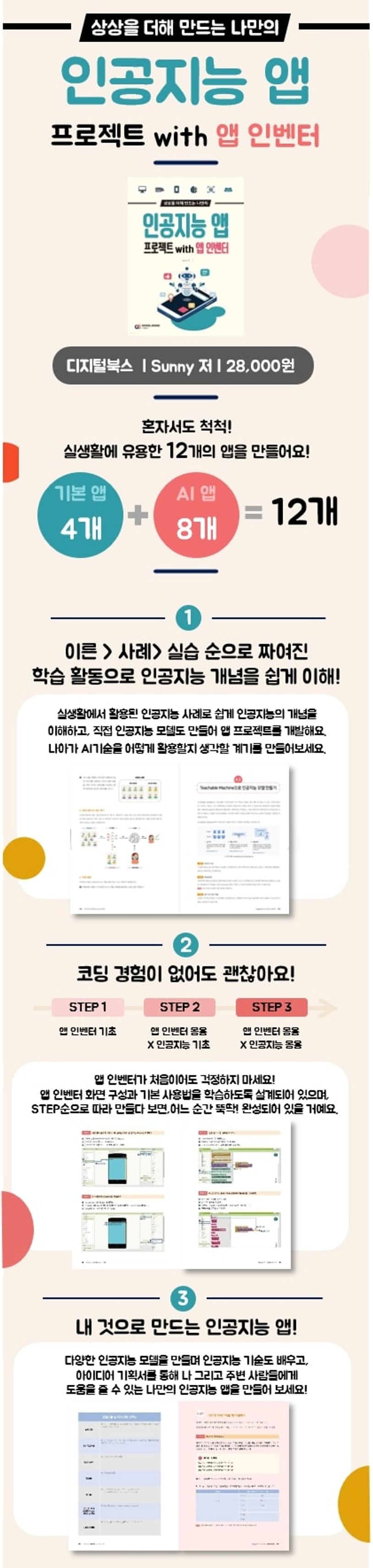 ==========================================CHAPTER01안녕?인공지능!==========================================1.1인공지능이란?1.2인공지능의역사1.3인공지능?머신러닝?딥러닝?1.4인공지능과함께사는세상==========================================CHAPTER02앱인벤터사용가이드==========================================2.11단계:앱인벤터란?2.22단계:준비물챙기기2.33단계:앱인벤터화면구성알아보기2.44단계:블록바로알고사용하기2.55단계:앱만들고설치하기==========================================CHAPTER03앱인벤터속성과외==========================================3.1앱개발순서알아보기3.2LED무드등앱만들기3.3BMI계산기앱만들기3.4도전!1000ml앱만들기3.5보이스계산기앱만들기==========================================CHAPTER04앱X인공지능프로젝트==========================================4.1인공지능모델구현과정알아보기4.2TeachableMachine으로인공지능모델만들기4.3찰칵!검색앱만들기4.4스마일챌린지앱만들기4.5시크릿보이스다이어리앱만들기4.6무궁화꽃이피었습니다게임앱만들기==========================================CHAPTER05앱X인공지능심화프로젝트==========================================5.1_______을위한_______앱만들기5.2꽃에관심있는사람을위한꽃백과사전앱만들기5.3청각장애인을위한위험감지앱만들기5.4정확한자세로운동하고싶은사람을위한스쿼트헬퍼앱만들기