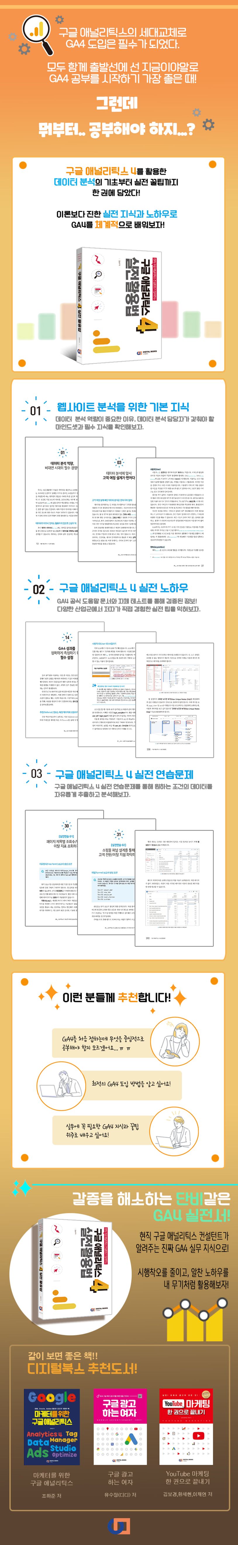 “구글 애널리틱스 4 실전 활용법”은 구글 애널리틱스 4 학습을 막 시작하는 현직자나 예비 마케터를 대상으로 한, 구글 애널리틱스 기본서입니다. 단순한 이론보단 바로 쓸 수 있는 실무 지식을 담는 데 초점을 맞춰 다양한 정보를 다룹니다. 구글 애널리틱스 4(GA4)의 기초 지식부터 구글 빅쿼리(BigQuery) 연동, 구글 태그 매니저(GTM)를 활용한 이벤트 적용 등 고급 정보, 그리고 실전 연습문제까지 알차게 담았습니다.