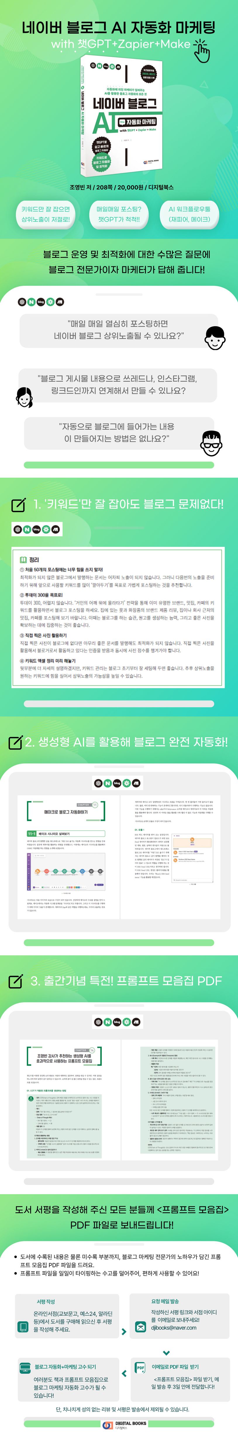 15년 차 마케터이자 17년 차 블로거로 실무에서 경험이 탄탄한 마케팅 전문가인 저자는 네 번째 책인 『네이버 블로그 AI 자동화 마케팅 with 챗GPT+Zapier+Make』에서 그간 저자가 현장에서 갈고닦은 노하우를 바탕으로 ‘AI 기반 블로그 자동화’ 방법을 알려 주고 있습니다. 이 책은 네이버 블로그를 중심으로, 생성형 AI와 다양한 워크플로우 툴을 활용한 자동화 전략을 체계적으로 제시합니다.