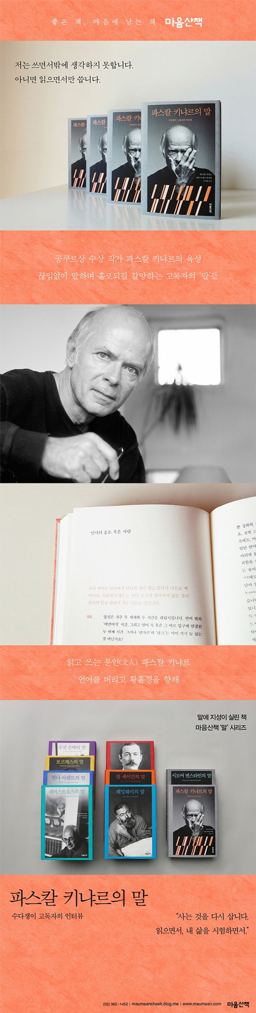 마음산책의 아홉 번째 ‘말’ 시리즈, 『파스칼 키냐르의 말』은 그간 문학작품으로만 접할 수 있었던 파스칼 키냐르의 생생한 육성이 담긴 인터뷰집이다. 아카데미프랑세즈 문학상과 공쿠르상 수상자인 파스칼 키냐르는 프랑스 현대문학에서 가장 중요한 작가 중 한 명으로 늘 거론되는 작가이기도 하다. 그의 저작들은 소설, 산문, 비평, 시, 철학, 우화 등을 폭넓게 아우르는데, 이 같은 다종다양의 작품들은 키냐르가 추구하는 “파편적 글쓰기”의 산물이다. 그는 장르라는 것은 잘못 한정된 것이니 여러 장르를 혼합해 글을 씀으로써 장르 문법을 무너뜨리거나 장르 자체를 아득히 뛰어넘을 수 있다고 본다.