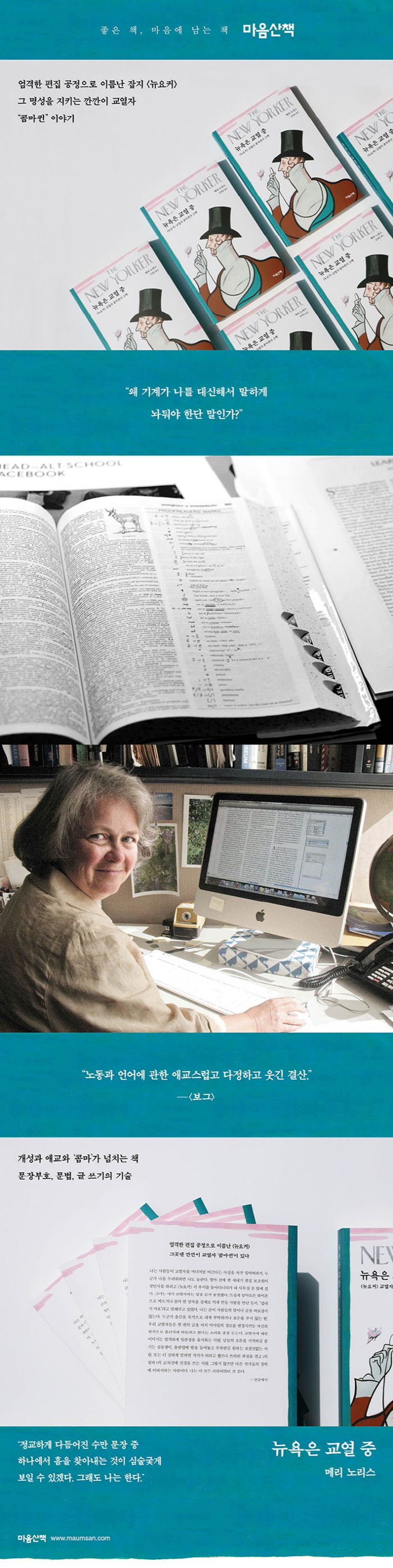 《뉴요커》의 책임 교열자 메리 노리스가 40여 년간 글을 다루며 작가들 그리고 동료들과 치고받은 에피소드를 돌이키고 장막 안에서 《뉴요커》가 돌아가는 모습을 그리며, 구두점ㆍ대시ㆍ세미콜론ㆍ하이픈ㆍ아포스트로피 할 것 없이 문장부호와 영어 문법에 대해 전천후로 고찰하는 『뉴욕은 교열 중』. 기계적일 수 있는 교열 업무에 따르는 숱한 고민과 번복, 논의와 결단, 인간미 넘치는 좌충우돌을 《뉴요커》 안팎의 일화로 유머러스하게 전한다.