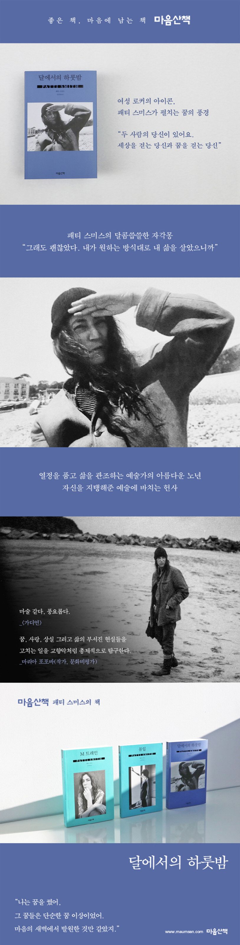 『달에서의 하룻밤』은 『M 트레인』 『몰입』에 이어 마음산책에서 펴내는 패티 스미스의 세 번째 산문집이다. 현실과 환상을 오가는 패티 스미스 특유의 문체가 드러나는 『달에서의 하룻밤』은 그가 칠순을 맞이하면서 겪었던 한 해 동안의 방황과 고뇌를 꿈결처럼 아름답게 기록한다. 지구적 환경 위기, 미국 내부의 정치적 갈등, 오랜 친구들의 노쇠와 죽음을 겪으면서 패티 스미스는 자신의 실존을 돌아보고, 현실보다 더 생생한 꿈의 세계로 독자를 초대한다. 모텔의 간판이 말을 걸면서 시작하는 꿈속 세계에서 그는 시시각각 눈 색깔이 바뀌는 수수께끼 같은 인물을 만나고, 해변이 사탕 포장지로 뒤덮이는 기이한 현상을 경험한다. “마음의 새벽에서 발원”한 듯한 꿈속 세계에서 불가능했던 일이 일어나고, 깊어진 감정들은 그의 앞에 이미지로 현현한다. 이렇듯 패티 스미스는 마음속 꿈의 여행과, 미국 서부를 다녔던 실제의 여행기를 섬세한 시적 언어로 결합해 감동적으로 그려내고 있다. 이뿐 아니라 패티 스미스가 세계 곳곳에서 직접 찍은 사진들도 본문에 수록되어 독서의 즐거움을 더한다.