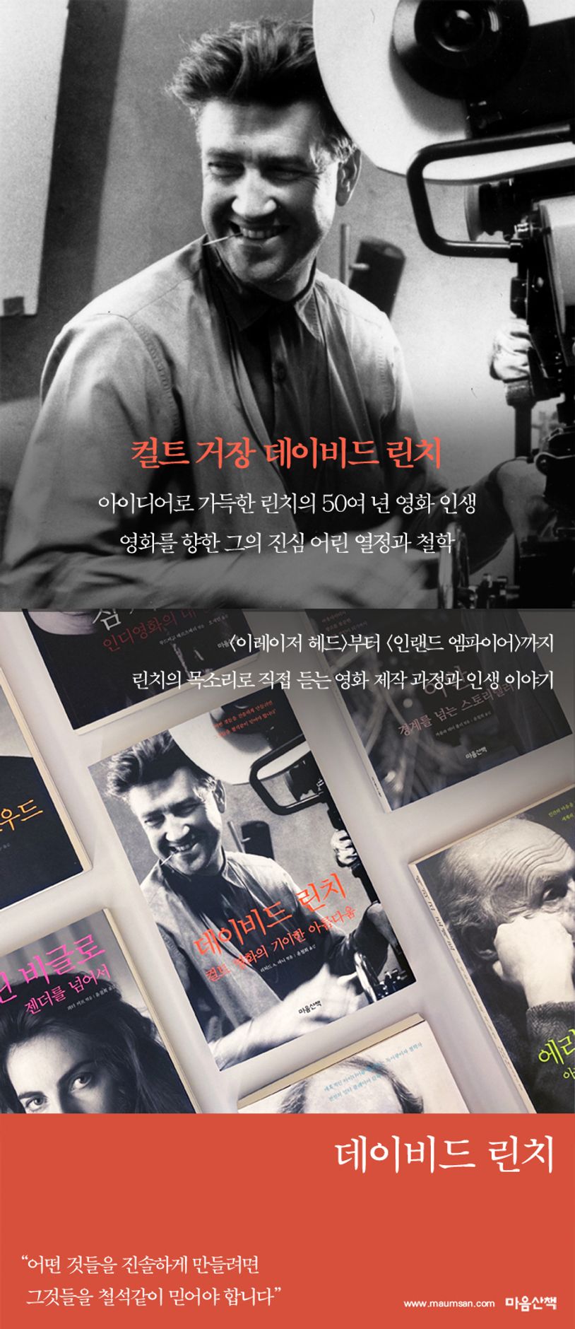 BBC에서‘21세기가장위대한영화1위’로선정한〈멀홀랜드드라이브〉.악몽속미로를걷는듯기이한매력을품은이영화를연출한감독은컬트거장이라불리는데이비드린치다.그의데뷔작〈이레이저헤드〉(1977)는영화계에신선한충격을전하며열광적인반응을얻었고,이후린치는〈엘리펀트맨〉〈블루벨벳〉〈트윈픽스〉〈광란의사랑〉〈스트레이트스토리〉〈인랜드엠파이어〉등을연출하며명실상부한거장으로우뚝올라섰다.마음산책영화감독인터뷰시리즈신간『데이비드린치:컬트영화의기이한아름다움』은린치가장편영화감독으로데뷔한1977년부터최근까지다양한매체에서했던총24편의인터뷰를엮은책이다.린치의회고록『꿈의방』의공저자인크리스틴매캐나를비롯해〈무비메이커〉〈필름코멘트〉〈포지티브〉등영화전문매체의기자들이진행하는심도있는인터뷰는린치의작품세계를연대기순으로조명한다.컬트거장이라는수식어뒤에숨겨진,영화를향한린치의진심어린열정과철학을그의목소리로직접들을수있다.각각의작품을만들때의잊을수없는에피소드,영화작업방식등에대해서도자세하게전하고있어서데이비드린치의팬이라면절대놓쳐서는안될기회다.또한유년기에예술적영감을주었던것들,미술가가되고싶었지만영화로진로를바꾸게된청년기,〈이레이저헤드〉를연출할때내면의위기를겪고‘초월명상’에빠진계기등이전에잘알려지지않았던린치의삶이야기가담겼다.이런말을하는사람들이있죠.“좋아,우리는사회이슈를다룬영화를집필할거야.”그러고는그걸목표로작업을시작합니다.그목표를뒷받침하는영화를만들어내죠.나는전혀그런방식으로작업하지않았습니다.나는아이디어들을얻는것으로시작했습니다.아이디어가그냥뚝떨어졌습니다.내가굉장히몸이달아있었다는뜻입니다.정말로술술써냈어요.아이디어들은그런방식으로생겨났습니다.조각조각난상태로생겨난겁니다.그런후에나는조각들전체를하나로연결해줄실을구했고이런저런작업을했죠.실을구하고나니까다른것들이모여들었고,나는머릿속으로그것들을정리했습니다.나는부조리를사랑하기때문에그런걸많이확보했습니다.유머도있었고요.-본문47쪽“바닥에나뒹구는건멋진경험입니다”〈이레이저헤드〉부터〈인랜드엠파이어〉까지영화연출의고통과기쁨에대해지금은미국영화계를대표하는거장인린치도한때는데뷔작을완성해내기위해고군분투하던시기가있었다.영화개봉전후에한인터뷰들은당시의분위기를고스란히전하고있는데,〈이레이저헤드〉를연출할때의에피소드를들려주는부분에서는영화를향한신인감독린치의고민과패기를엿볼수있다.그는1971년부터1976년까지제작비가거듭바닥나는상황에서도〈이레이저헤드〉를완성하기위해노력했다.영화세트장에본인이실제로거주하기도했는데해당장소의분위기를체화할수있어서좋은기회였다고린치는말한다.이후그는〈로스트하이웨이〉(1997)를연출할때도자신의실제집에서영화일부를촬영하기도한다.아카데미작품상등후보에오른〈엘리펀트맨〉(1980)제작기도흥미롭다.영화의배경인빅토리아시대분위기를재현하기위해흑백으로촬영하기로결정하고,촬영감독과긴밀히협의하는과정을드러낸부분에서는영화촬영이구체적으로어떻게진행되는지를알수있다.앞선두작품으로명성을얻은후,비교적큰예산으로연출한SF영화〈사구〉(1984)가흥행과비평모두실패했을때는“최종편집권을갖지못한영화를만드느니영화를만들지않는편이낫”다는교훈을얻었음을고백한다.대표작〈블루벨벳〉(1986)관련인터뷰에서는영화에대한그의철학이선명하게드러난다.그는세상의“표면아래에서진행되는완전히다른무엇”인가가늘있고,영화가하는일중하나는바로그표면아래의갈등을보여주는것이라고말한다.이런“어둠”에끌리기에그것을영화로표현하고싶다는것이다.나아가그는감독이라면자기작품에대해“솔직하게느껴야”하고‘자신의아이디어에충실하면서자기자신을신뢰해야한다’고조언을건넨다.칸영화제감독상수상작인〈멀홀랜드드라이브〉(2001)제작비화도인상적이다.이작품은원래TV드라마파일럿으로제작되었지만시리즈가무산되면서공개자체가어려워질위기에처한다.린치는재촬영과재편집을한끝에이파일럿을영화로완성해내고,〈멀홀랜드드라이브〉는“〈선셋대로〉이후로나온할리우드배경영화중최고”라는찬사를받는다.이렇게감독으로서산전수전을겪은린치는영화인생을돌아보며모든것을‘숙명’으로받아들이고달관하는모습을보여준다.〈사구〉와〈트윈픽스〉영화판의실패도,또다른성공도“숙명의쇄도”라고언급하는부분에서거장의남다른여유가느껴진다.린치가재단을설립해서사람들에게전하고있는‘초월명상’에대한내용도책에포함되어있다.〈이레이저헤드〉를만들무렵,내면적인위기를겪은그는‘초월명상’을통해삶의균형을회복했고,그이후로도많은도움을받았다고하며그것에대해자세히논한다.린치는자신의직업적인생과개인적인생에닥친숙명을모두포용한다.“사람들이‘이또한지나가리라’라고말하는거랑비슷합니다.어떤면에서는근사한경험이었어요.우리는실패를해